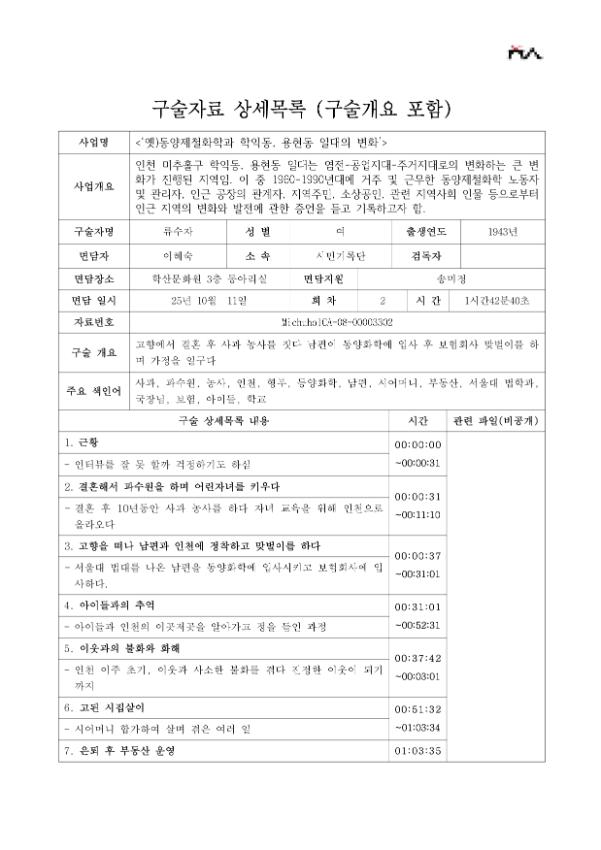 • 목    적 : 인천 미추홀구 학익동, 용현동 일대는 염전-공업지대-주거지대로의 변화하는 큰 변화가 진행된 지역임. 이 중 1960-1990년대에 거주 및 근무한 동양제철화학 노동자 및 관리자, 인근 공장의 관계자, 지역주민, 소상공인, 관련 지역사회 인물 등으로부터 인근 지역의 변화와 발전에 관한 증언을 듣고 기록하고자 함.