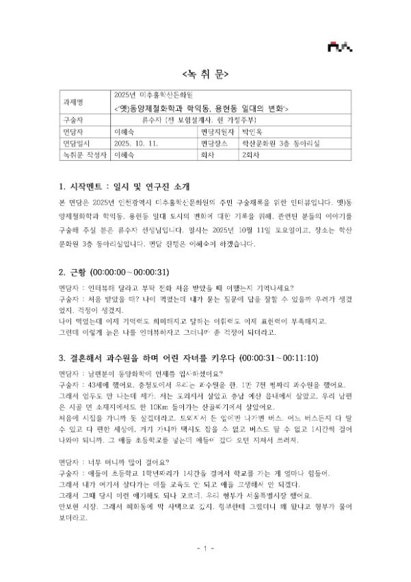 • 면 담 자 : 미추홀 시민기록단 이혜숙