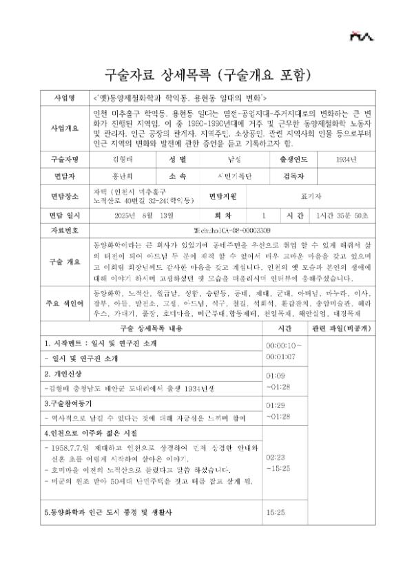 • 목 적 : 인천 미추홀구 학익동, 용현동 일대는 염전-공업지대-주거지대로의 변화하는 큰 변화가 진행된 지역임. 이 중 1960-1990년대에 거주 및 근무한 동양제철화학 노동자 및 관리자, 인근 공장의 관계자, 지역주민, 소상공인, 관련 지역사회 인물 등으로부터 인근 지역의 변화와 발전에 관한 증언을 듣고 기록하고자 함.