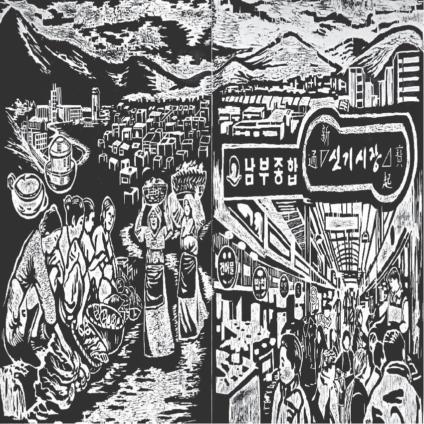 판그림으로 새기는 우리동네Ⅱ ‘안녕, 신기촌 사람들’ 생활예술로서의 커뮤니티 판화, 주민들이 함께 만든 대형 판화작품 다른 구에 비해 재래시장의 수가 많은 미추홀구의 신기시장과 그 주변에서 살아가고 있는 사람들의 이야기를 이미지화하여 판에 새기고 온몸으로 눌러 노동하듯 주민들이 직접 찍어낸 작품입니다. 진흥요업(중앙도자기) 입구에서 푸성귀를 팔며 시작된 신기시장, 이주민들이 와서 살았던 10평 쪽방촌 그리고 현재의 신기시장 모습을 담아냈습니다 작업기간 : 2018.11.09. ~ 2018.12.15. 작품크기 : 246cm × 121cm 제작기법 : Wood cut (목판화) 만든사람 : 백목련, 손은정, 윤진한, 이미숙, 이혜숙, 한선화 (주민공동창작) 지도강사 : 윤종필, 윤언수