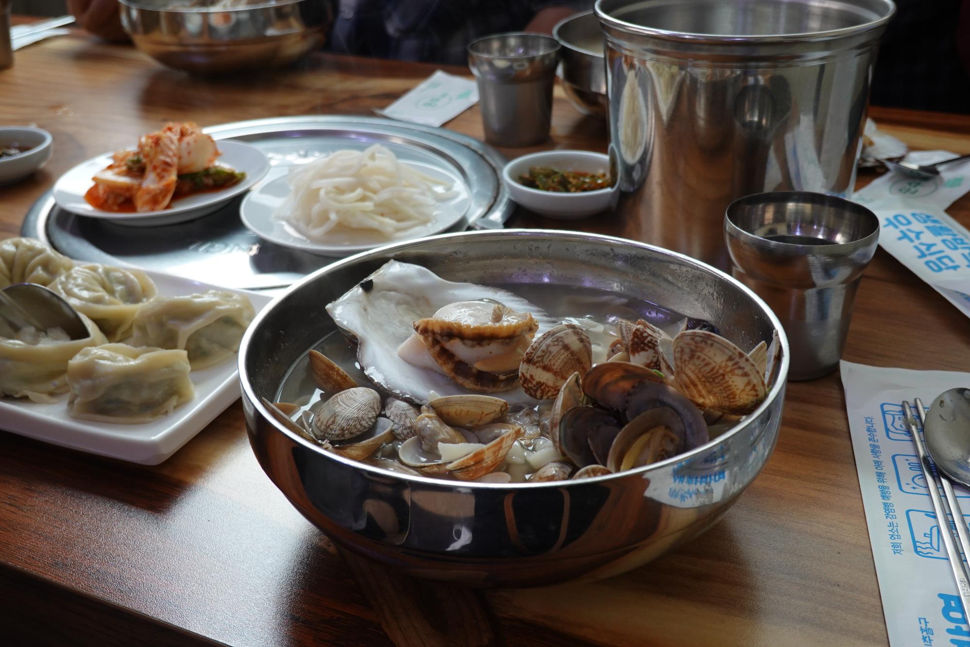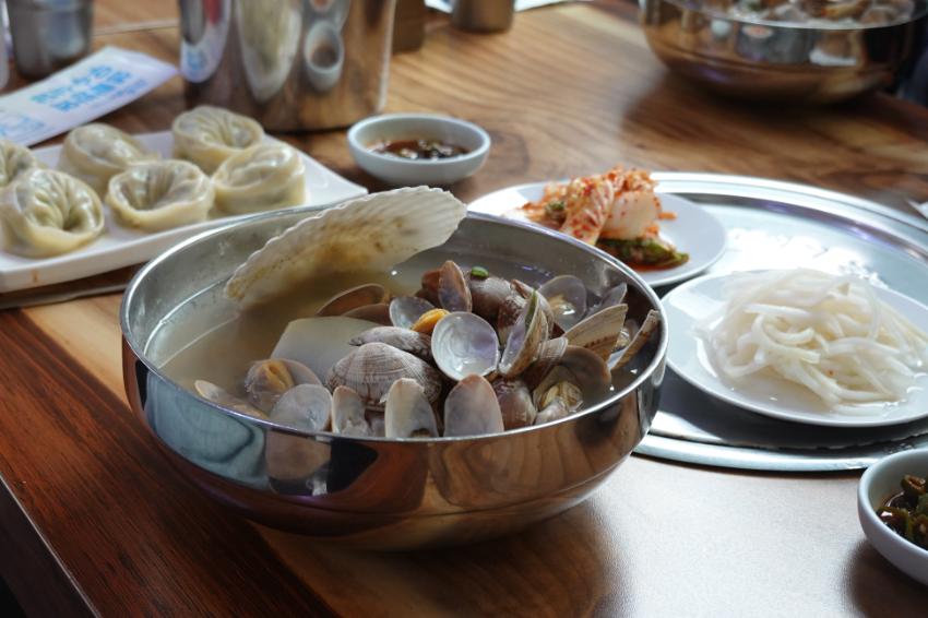 가리비칼국수 가게에서 파는 칼국수 사진이다. 이십여 년 전에는 삐죽조개(마당조개)라고 하는 조개를 주로 넣었지만, 현재는 갯벌이 오염되어 작업을 못하고 귀한 조개가 되어 바지락으로 끓이게 되었다고 한다.