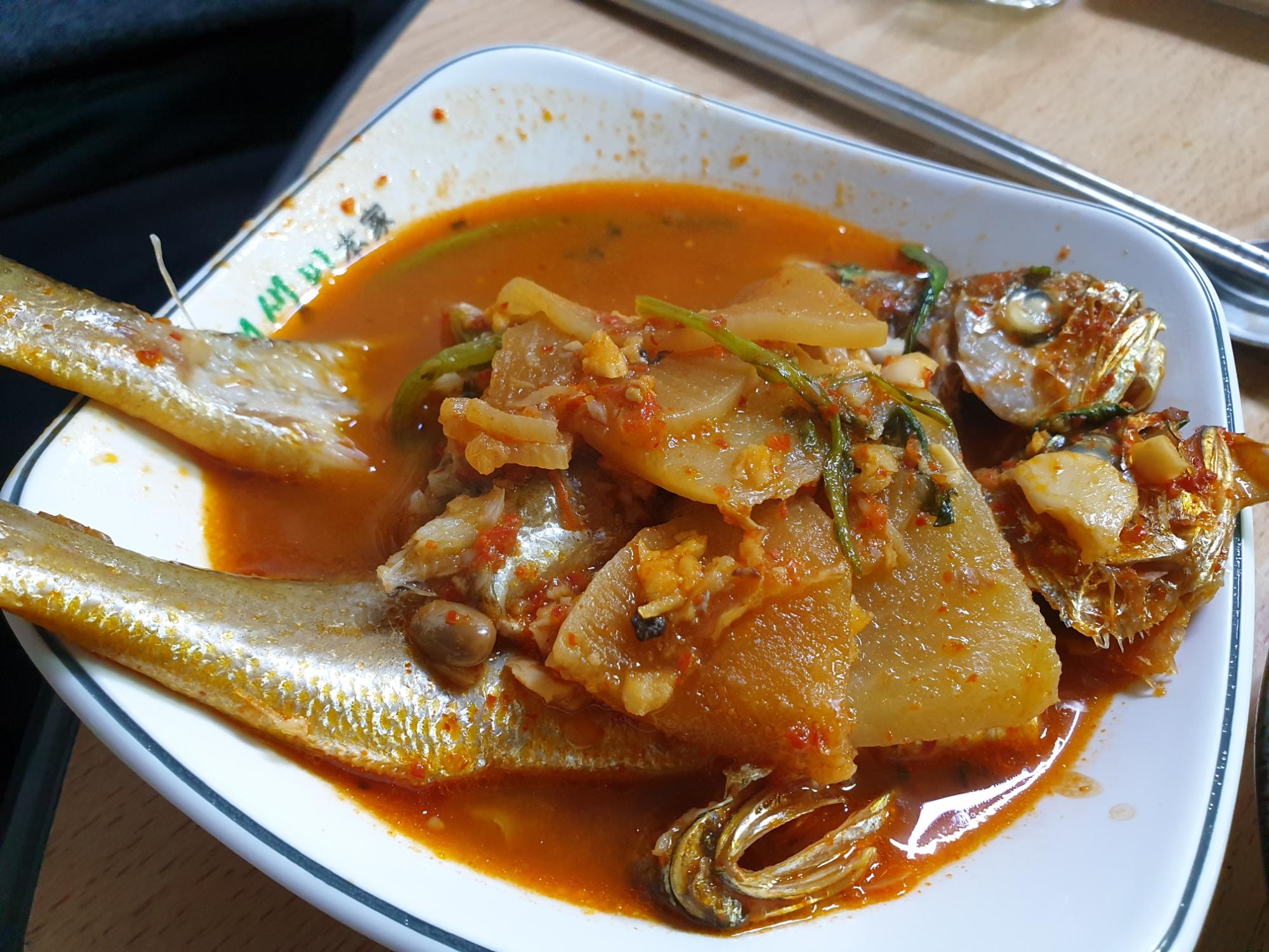 홍어전문점 조기탕 사진이다. 조기탕은 조선된장, 멸치액젓, 마늘, 소금을 사용하여 만든다. 재료가 많이 들어가지 않지만, 조기에서 단맛이나오고 무랑 쑥갓으로 더해 향과 맛을 조금 더 높일 수 있다.