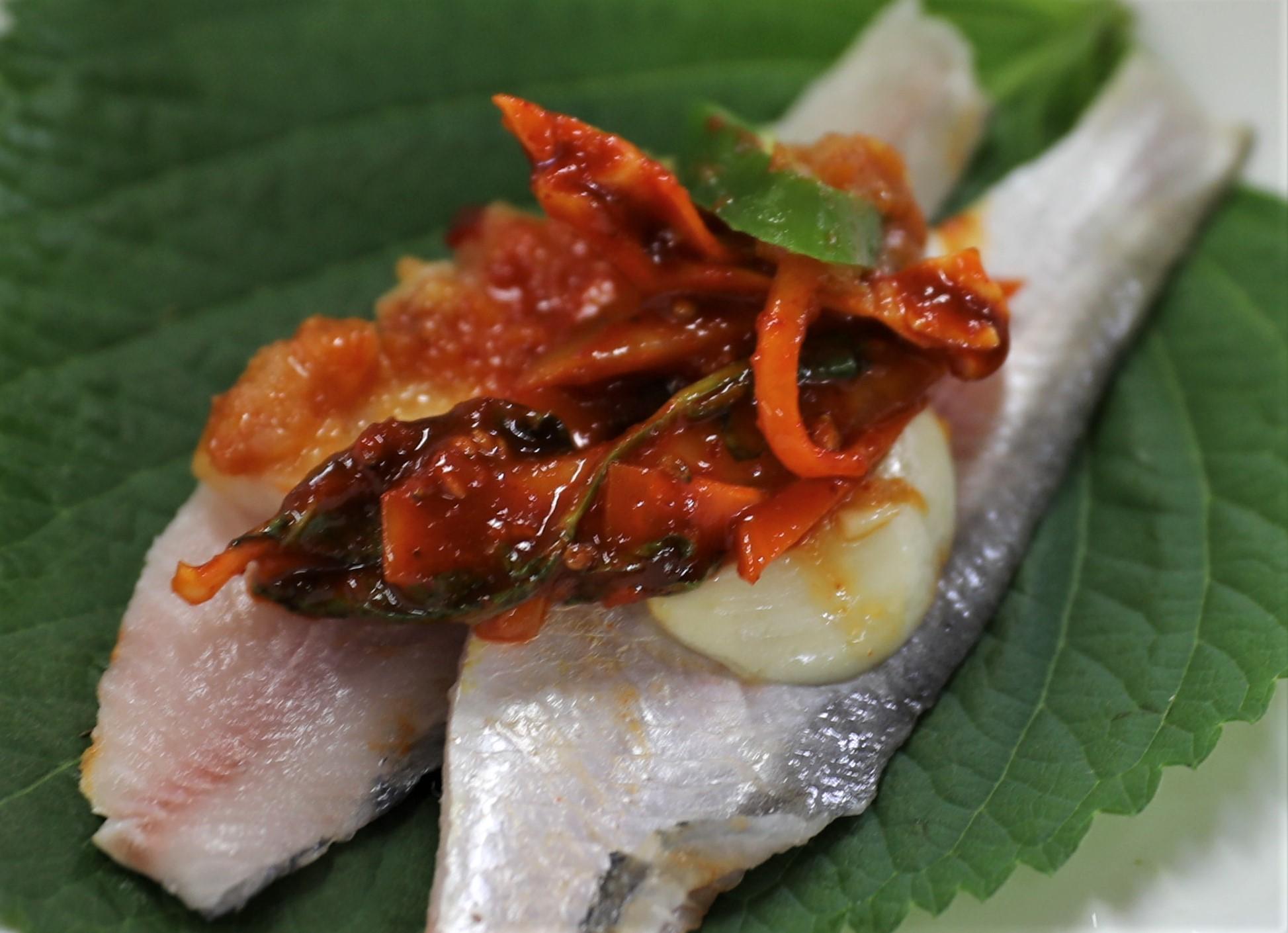 금산식당 밴댕이 강화도식 먹는 방법이다. 잘 손질된 밴댕이 회를 강화도식 쌈으로 싸서 먹는 사진이다. 무침양념과 마늘등을 넣어 쌈을 만들어 먹는다.