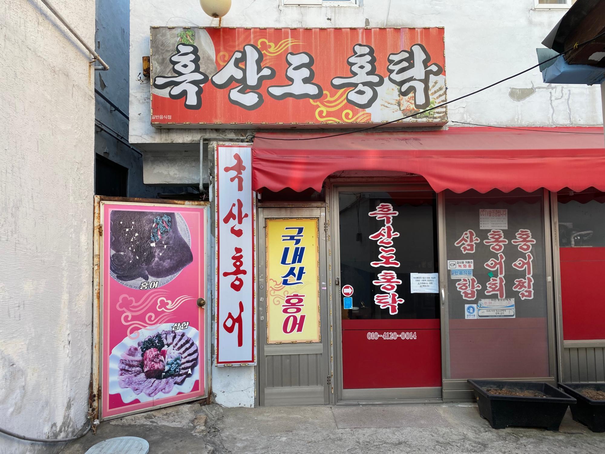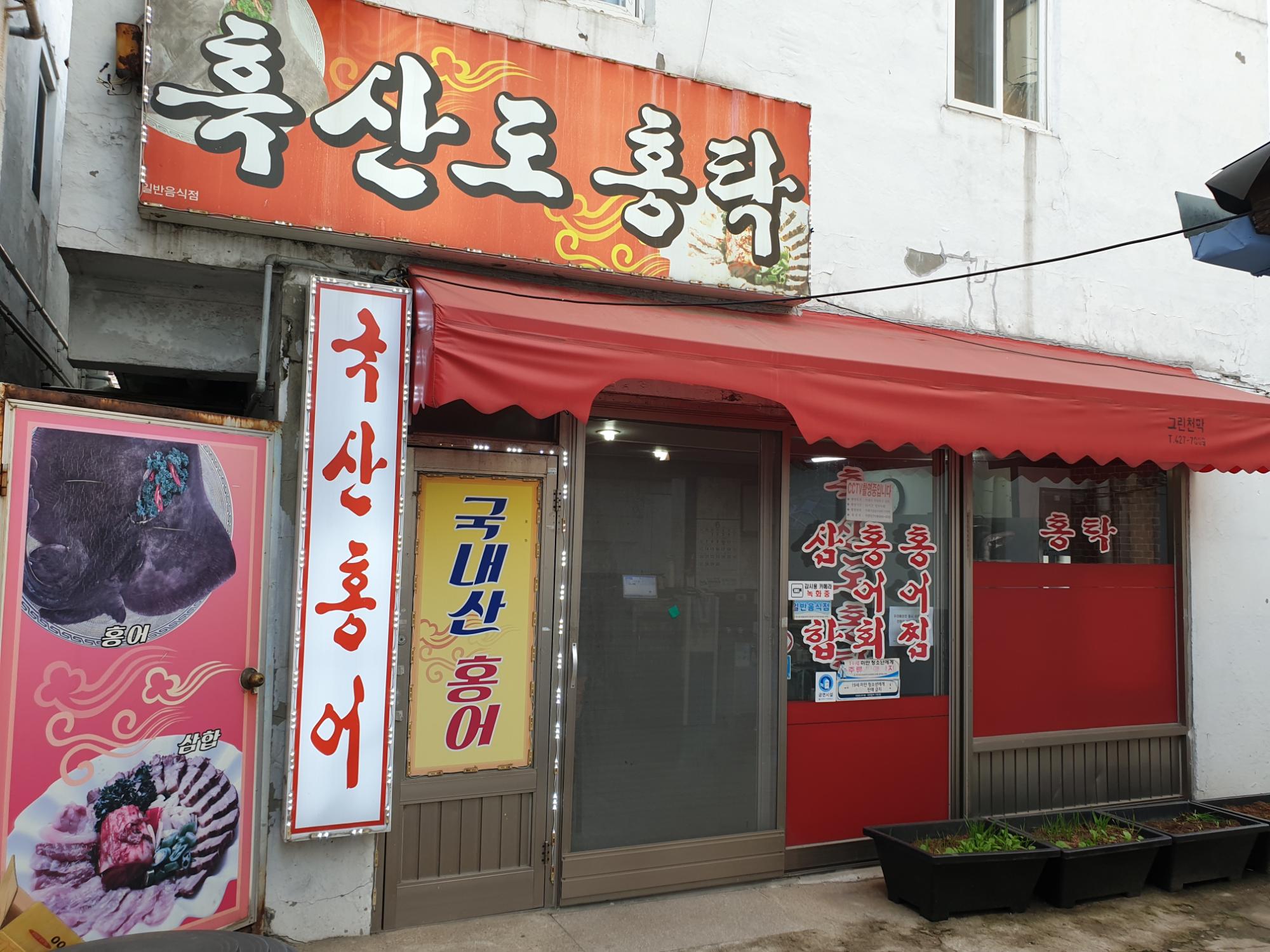 흑산도 홍탁 가게 전경사진이다.90년도에 인천에 오신 사장님, 2005년부터 현재까지 고향음식을 판매하고 있다. 약 16년동안 가게를 운영하고 있다.