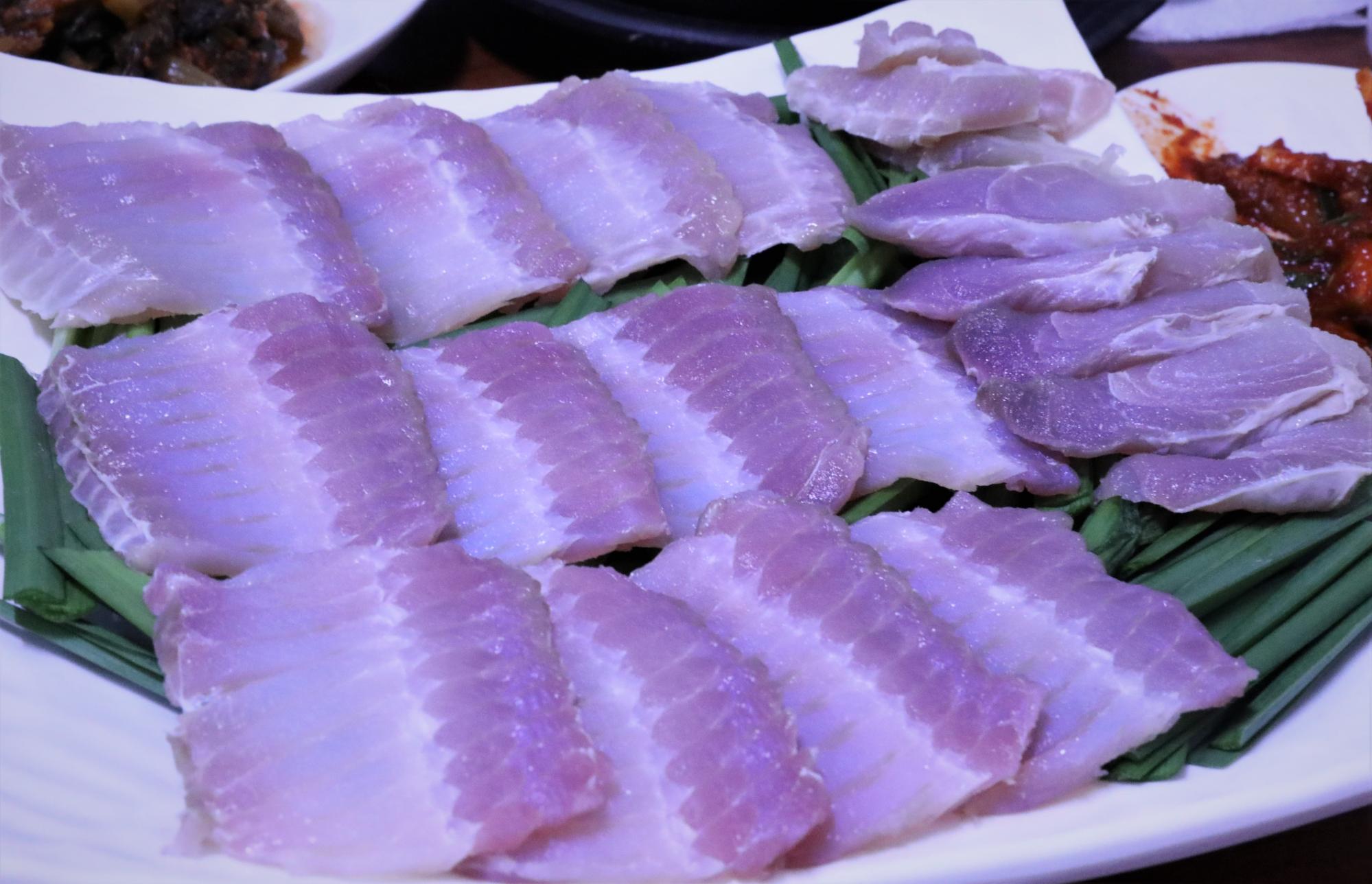 흑산도 홍탁 홍어삼합 사진이다. 흑산도 홍어를 직접 구매해 손질하고 삭혀서 홍어를 만들며, 더불어 수육은 몇시간동안 직접 매일 끓인다. 홍어와 함께 수육, 김치로 구성된 삽합은 손님들에게 제공한다.