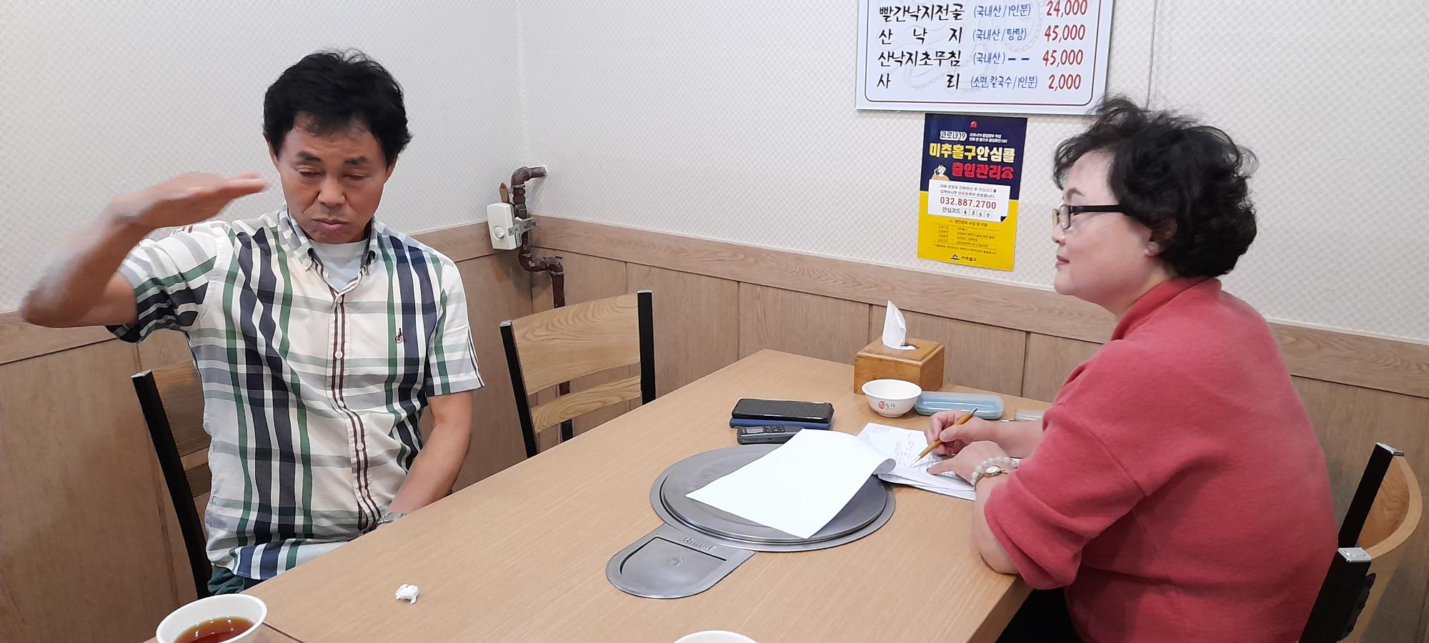 낙지마당 사장님 인터뷰사진이다. 미추홀구에 온지 22년이 되었으며, 낙지마당을 운영한지 14년째이다. 종종 구입한 배를 타고 낙지를 잡기도 하며, 현재 14년째 같은곳에서 가게를 운영중이다. 좋은재료와 변함없는 맛이 제일 중요하다고 생각한다.