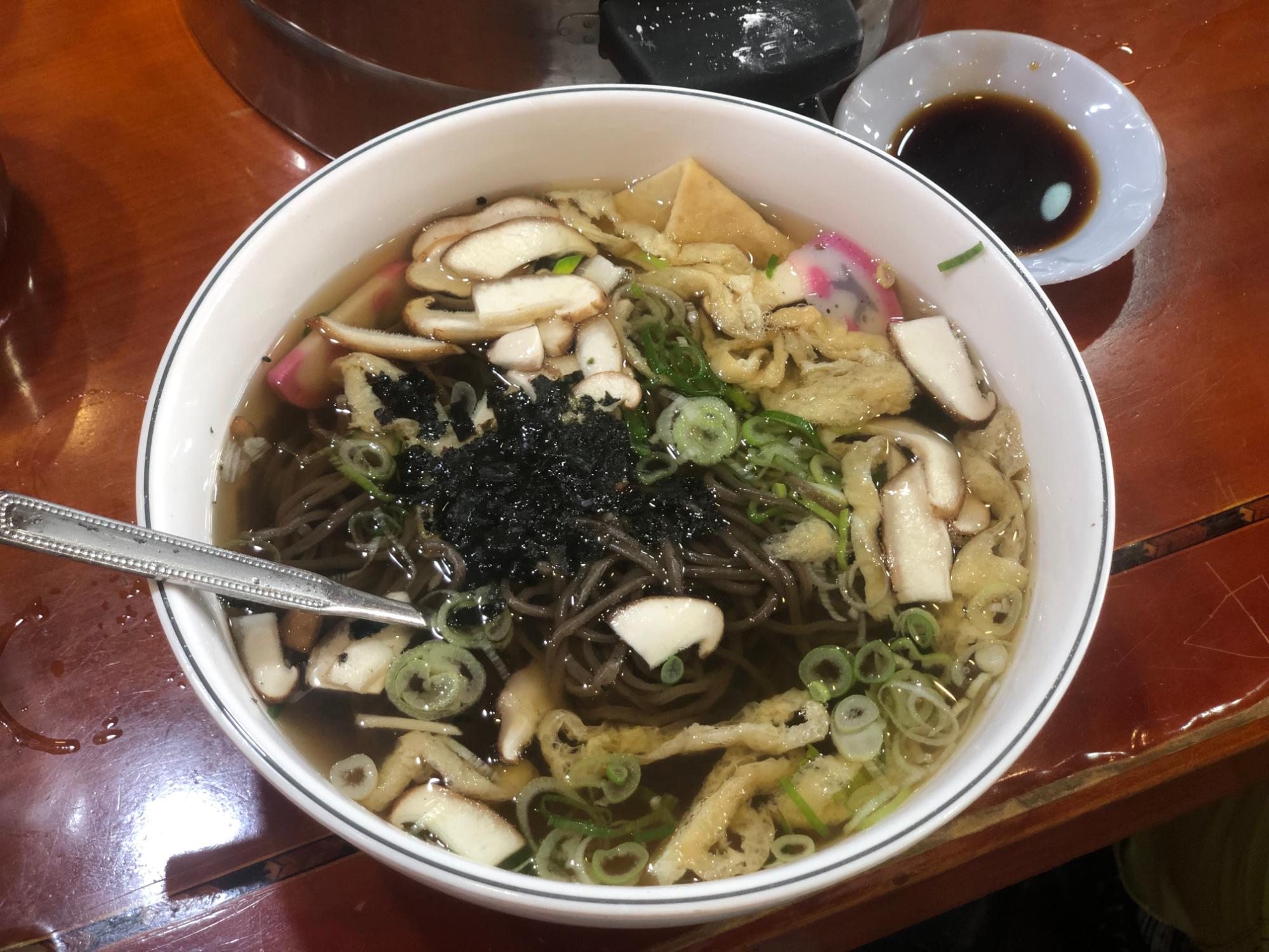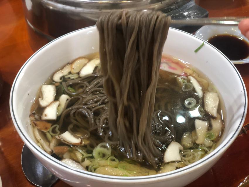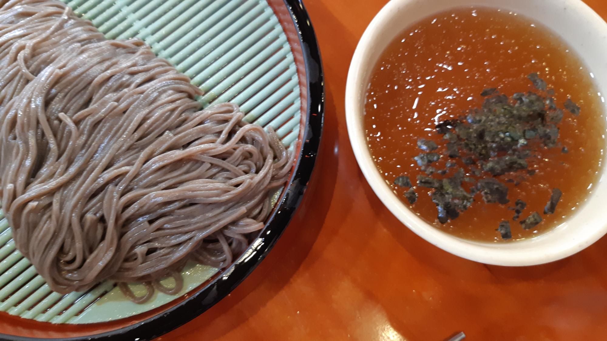 청실홍실 모밀국수 사진이다. 모밀은 공장에서 받아서 사용하며, 육수는 직접 개발하여 만들어 사용하고 있다. 육수에는 멸치, 바지락, 채소등 비밀재료도 들어가며, 육수를 항아리에서 숙성시켜 사용하고 있다.