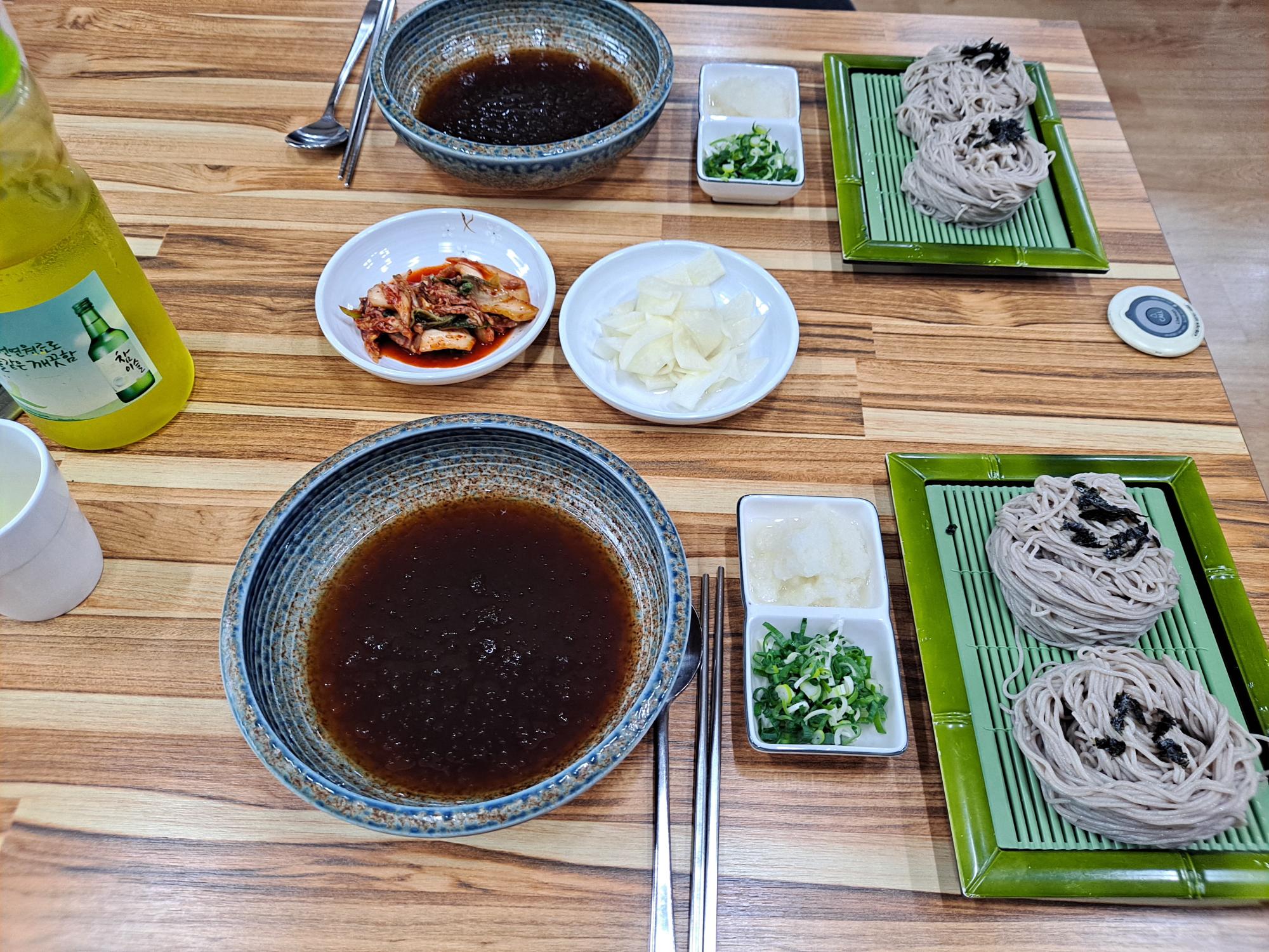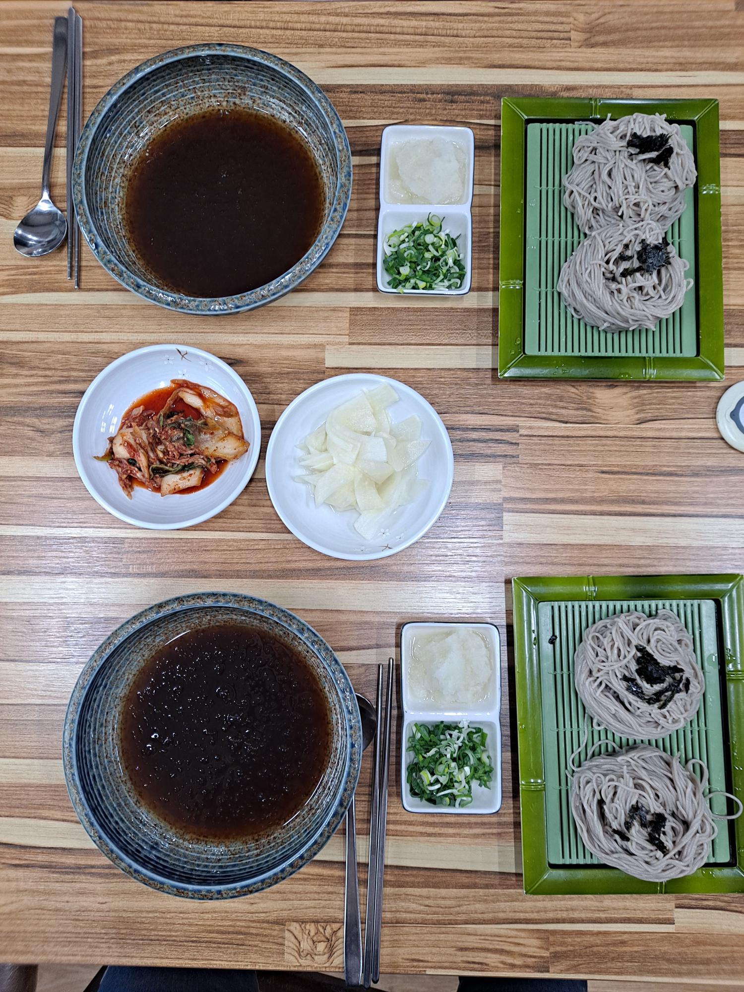 마루메밀 한상차림 사진이다. 기본반찬은 2가지 정도가 나오며, 100프로 메밀만을 사용해 제공하고 있다. 모든 음식은 원재료를 구매하여 전부 만들어 손님들에게 제공한다.