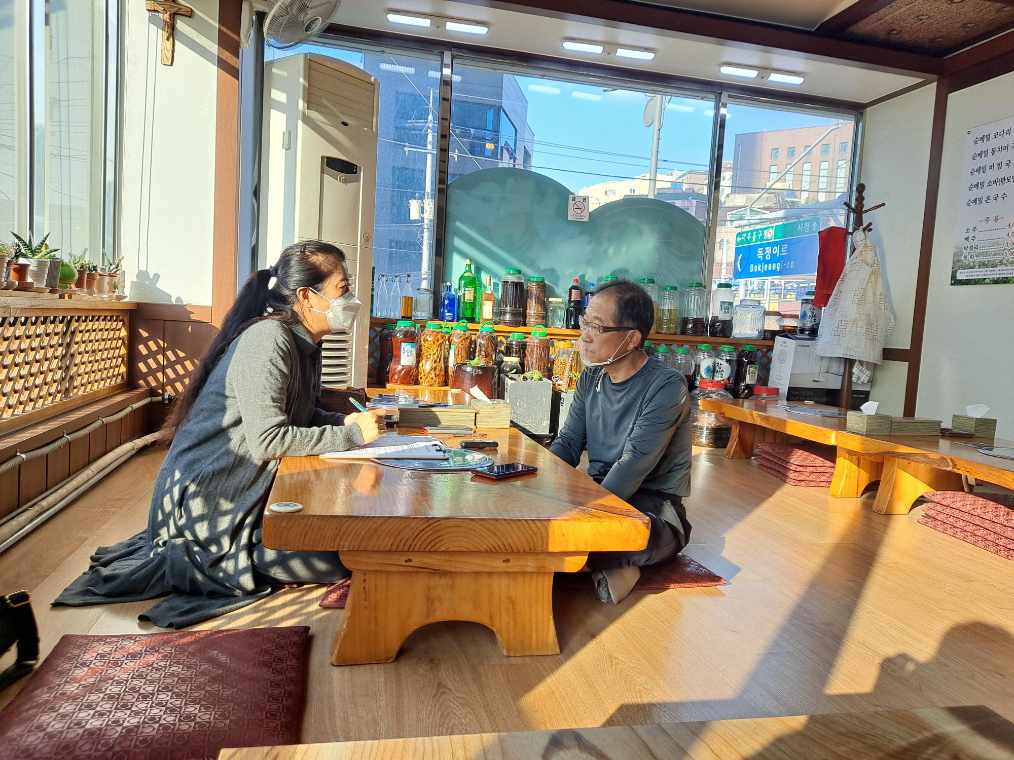 마루메밀 사장님 인터뷰 사진이다. 인천 토박이시며, 건축일을 하다 경기가 안좋아 일을 배워 메밀집을 운영하게 되었다. 기억에 남는 손님 중에 글루텐 성분 알레르기가 있는 손님이 있었는데, 메밀을 드신 후 알레르기가 일어나지 않아 믿고 찾아올 수 있는 곳이라고 얘기해주셨다. 믿음으로 올 수 있는 가게가 되었으면 좋겠다는 바람을 갖고있다.