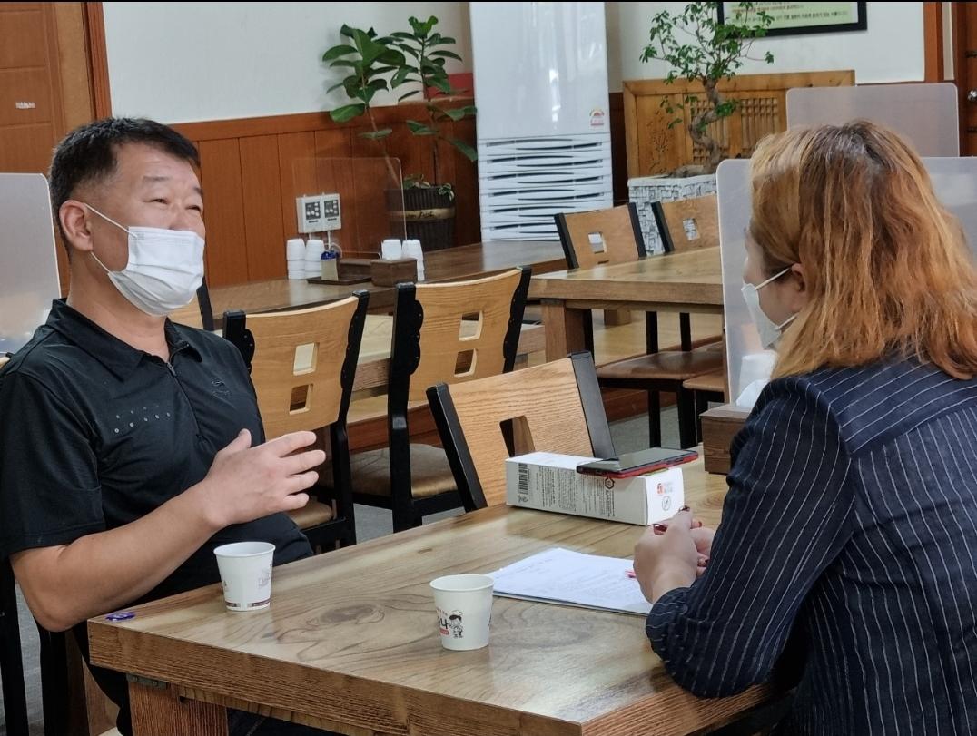 백령도 냉면 사장님 인터뷰 사진이다. 좋은재료를 사용하여 좋은음식을 제공하는 것이 제일 중요하며, 청결한음식과 친절한 서비스 또한 중요하다고 생각한다. 내가 싫어하는 것을 손님에게 하지 않으려고 한다.
