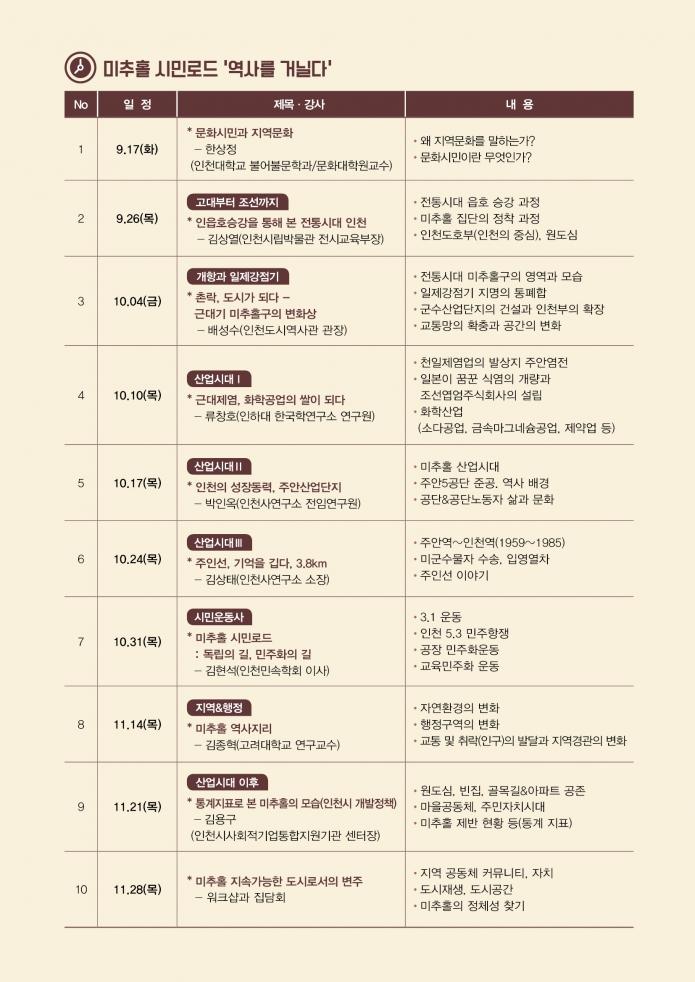 -교육내용 : 미추홀 역사의 시대별, 분야별 개관을 통해 미추홀 역사 마주하기 (총 10강_강의9강, 집담회1강)