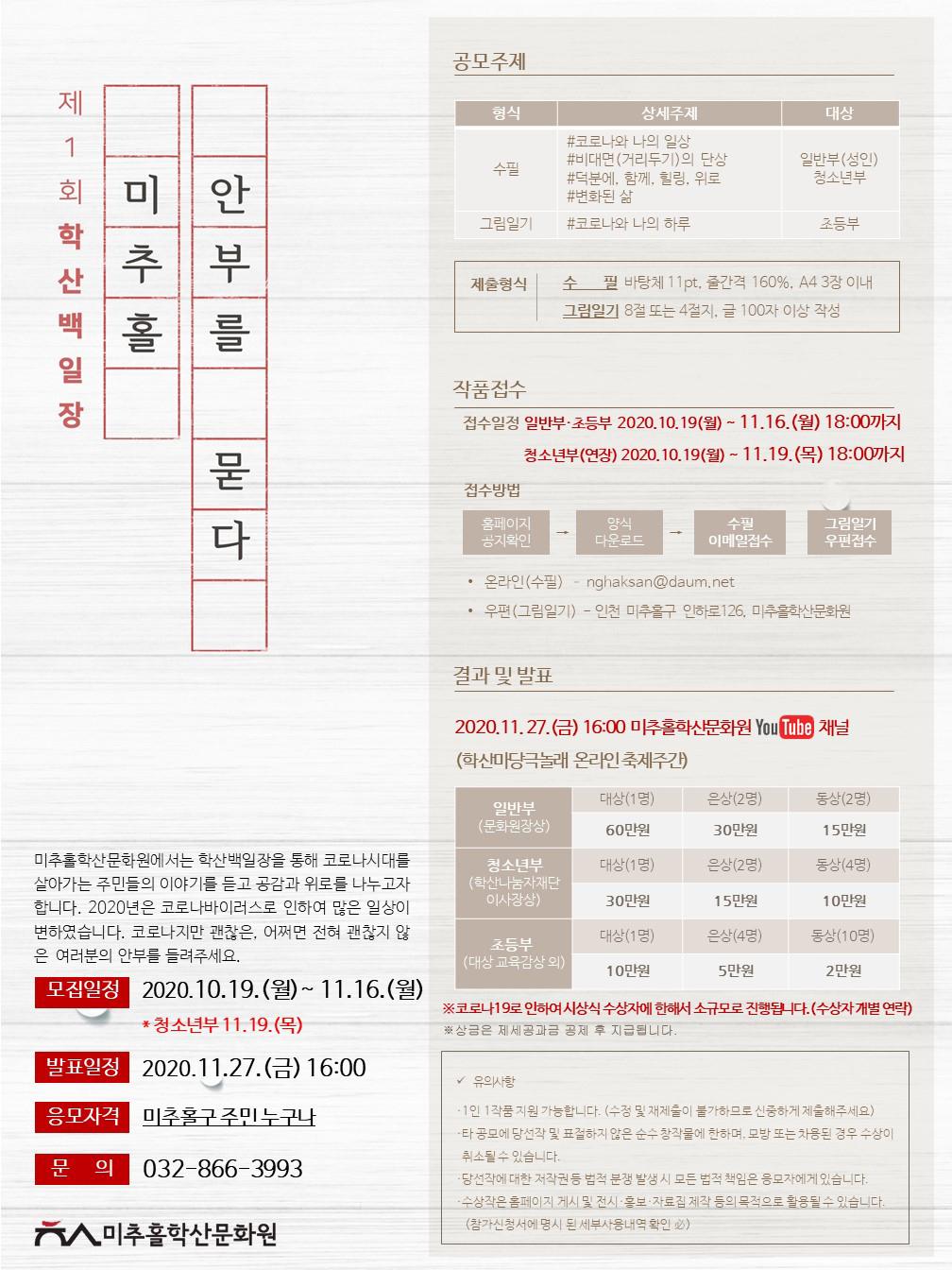 2020년 제1회 학산백일장 : '미추홀, 안부를 묻다.' 는 코로나19로 인해 다양한 경험과 변화된 삶의 모습, 그리고 앞으로의 희망 등에 대한 이야기를 들어보았습니다.