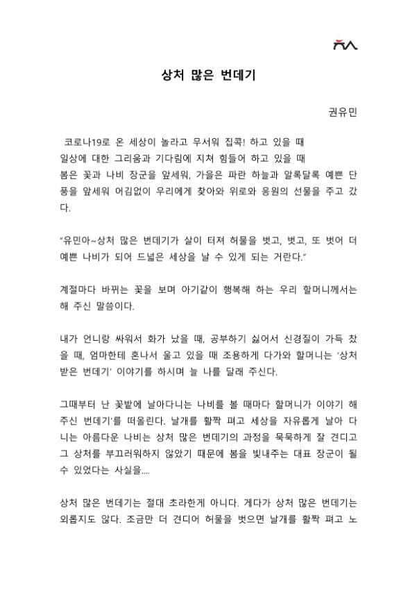 이 수필은 제1회 학산백일장 '미추홀, 안부를 묻다'에서 코로나로 변화된 일상과 그 속의 안부라는 주제로 쓴 권유민의 '상처 많은 번데기' 이며, 청소년부 부문 동상을 수상한 작품이다.