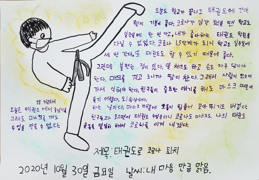 코로나 거리두기 단계가 완화되어 학교와 태권도 학원을 다닐 수 있어 행복한 마음을 담은 그림일기이다. 운동을 열심히 해서 코로나를 이겨내겠다는 다짐도 볼 수 있다.