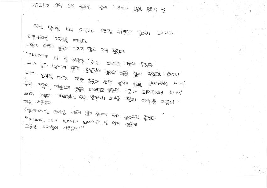 기쁠때 웃음을 더해주고 슬플때 위로가 되어주었던 애완견 태자가 하늘나라로 떠난 내용이다. 그림은 애완견 태자와 함께 놀았던 모습을 그렸다.