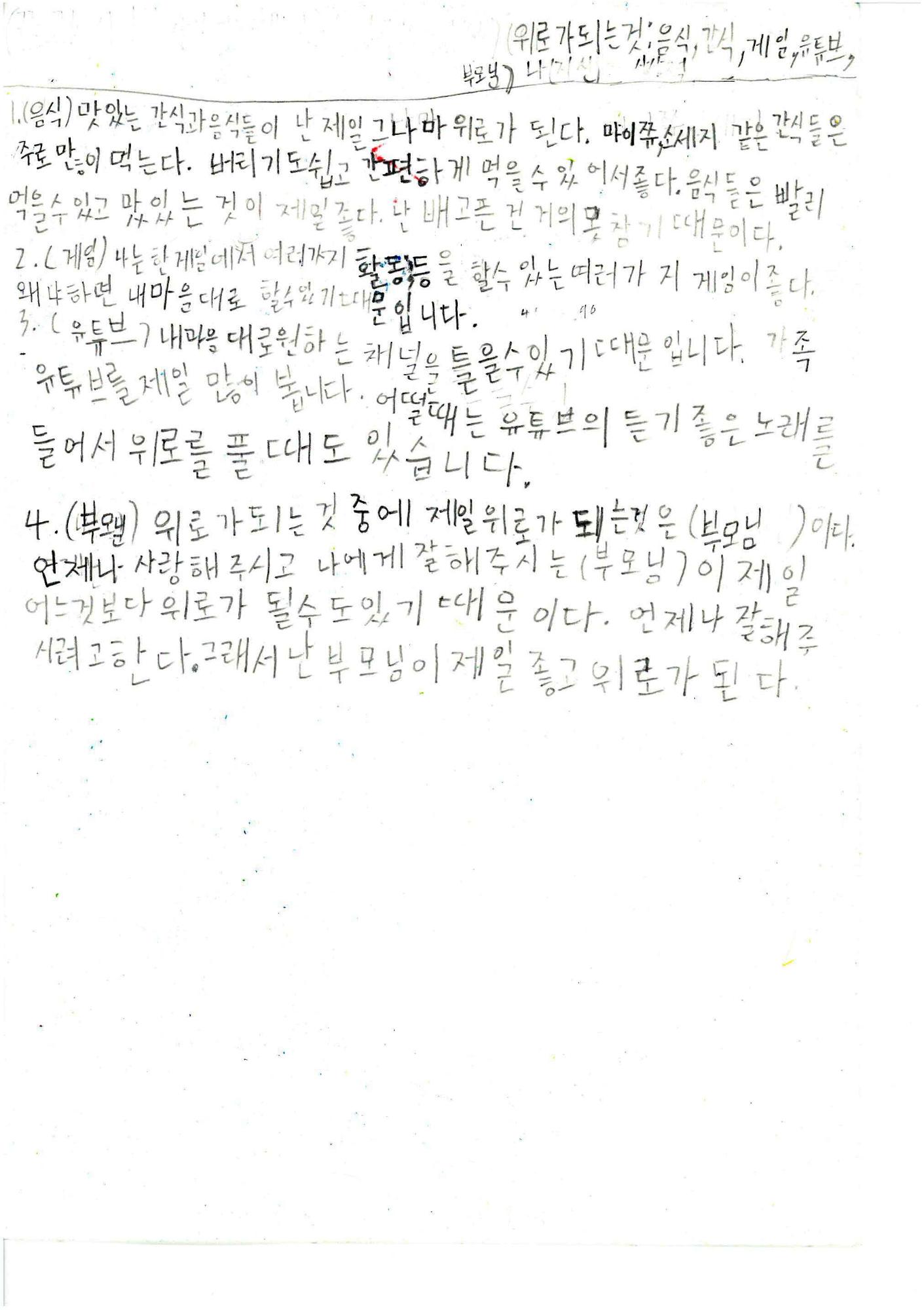 나에게 위로가 되는 것들로 4가지를 꼽았다. 맛있는 간식과 음식들, 여러가지 활동을 할 수 있는 게임, 유튜브에서 듣기 좋은 노래를 들어서 위로를 푸는 것, 그리고 언제나 사랑해주시고 잘해주시는 부모님이 제일 위로가 된다는 내용이다. 그림은 위로가 되는 것들을 쌓은 이미지로 나타냈다.