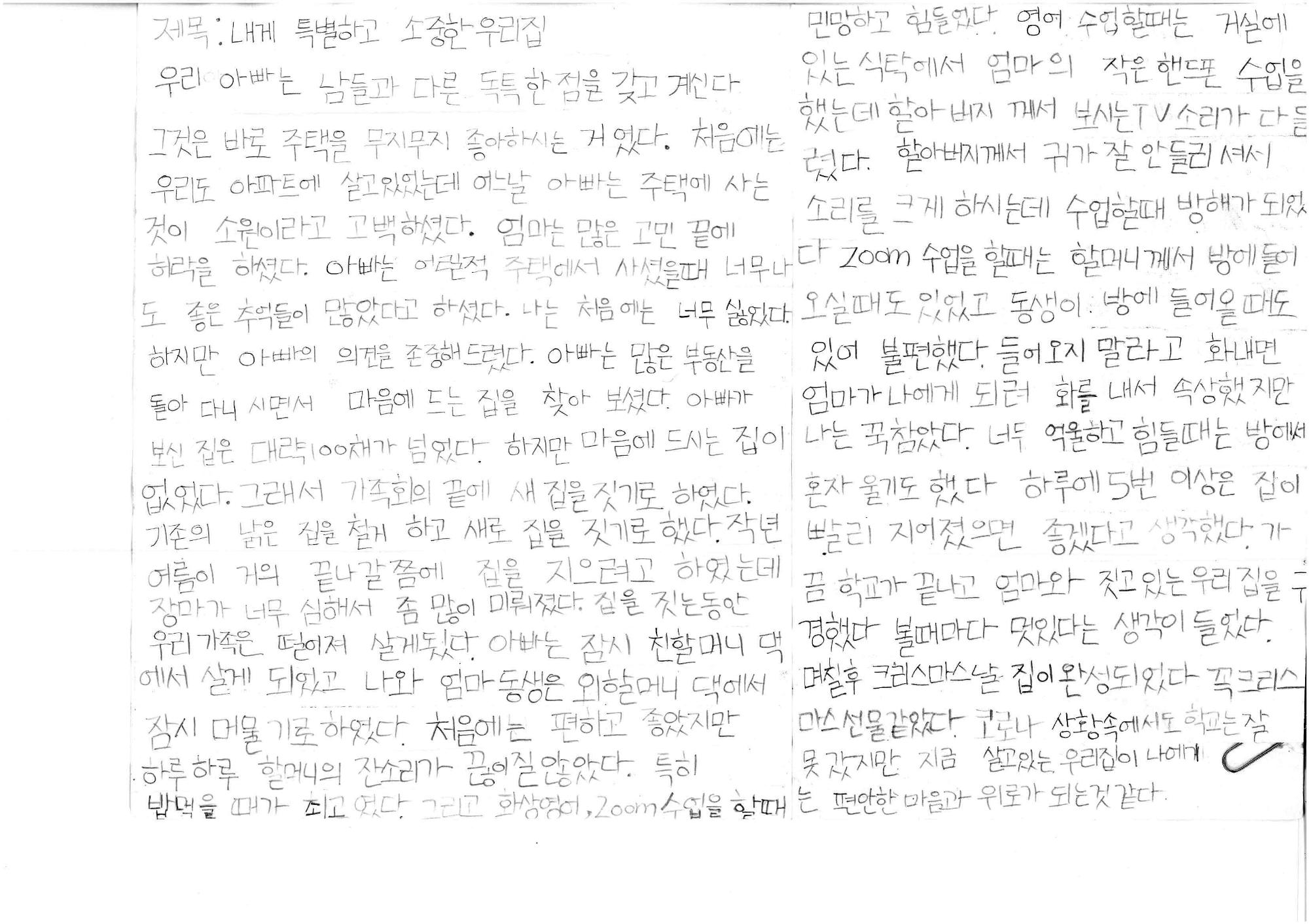 이 그림은 제2회 학산백일장 '미추홀, 삶을 위로하다'에서 내게 위로가 되는 것들이라는 주제로 그린 최선우의 '내게 특별하고 소중한 우리집' 그림일기이며, 초등부 부문 동상을 수상한 작품이다.