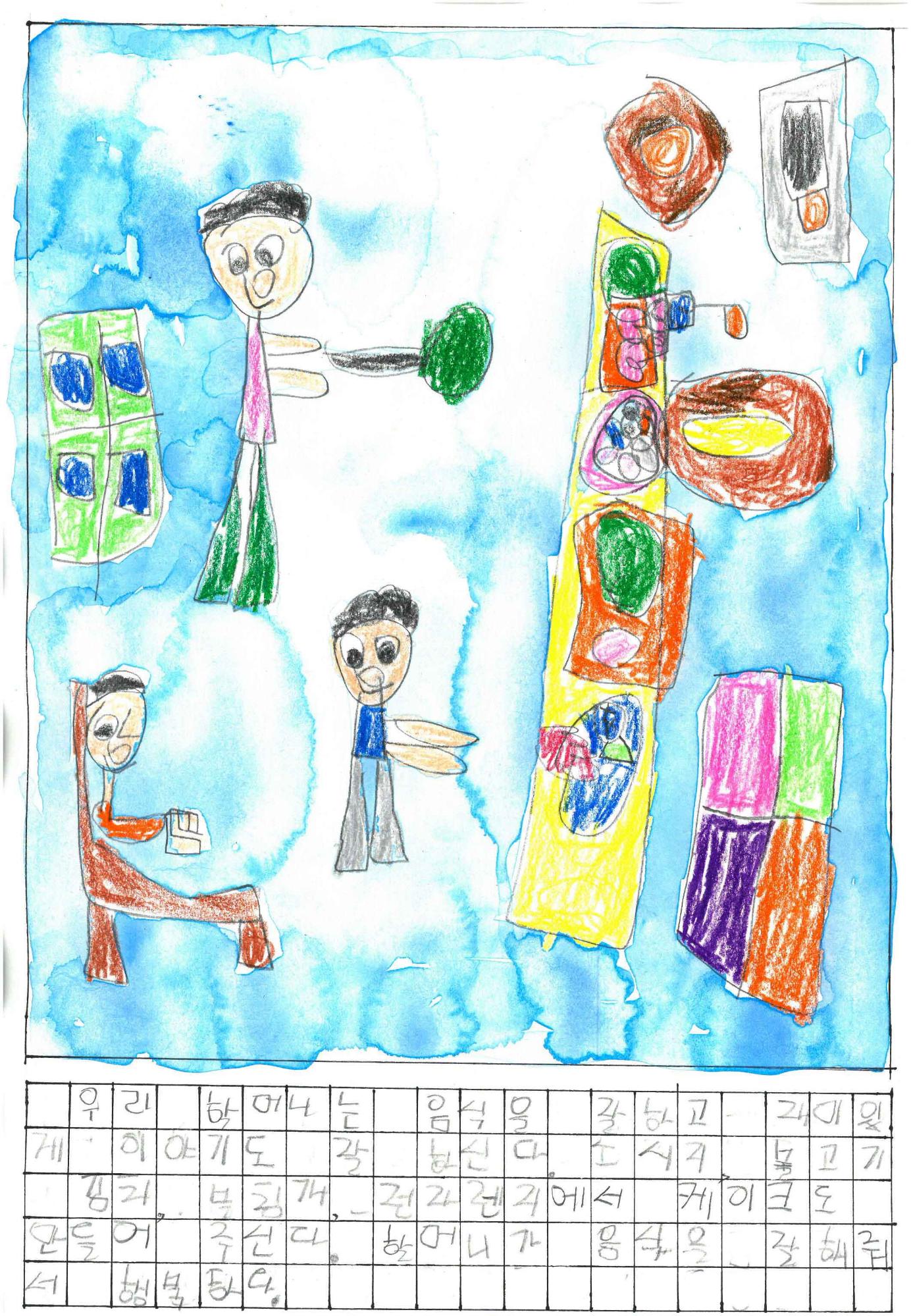 할머니가 소시지, 불고기, 김치 부침개 등 다양한 음식을 잘해줘서 행복하다는 내용이 담겨있다. 그림은 요리를 하고 있는 할머니의 모습을 그렸다.