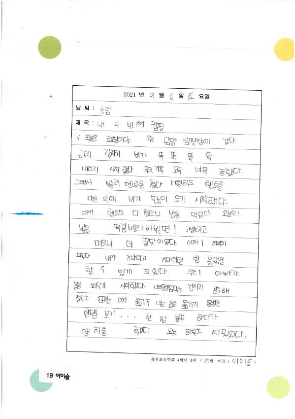 이 그림은 제2회 학산백일장 '미추홀, 삶을 위로하다'에서 내게 위로가 되는 것들이라는 주제로 그린 이이슬의 '내 두번째 캠핑' 그림일기이며, 초등부 부문 은상을 수상한 작품이다.