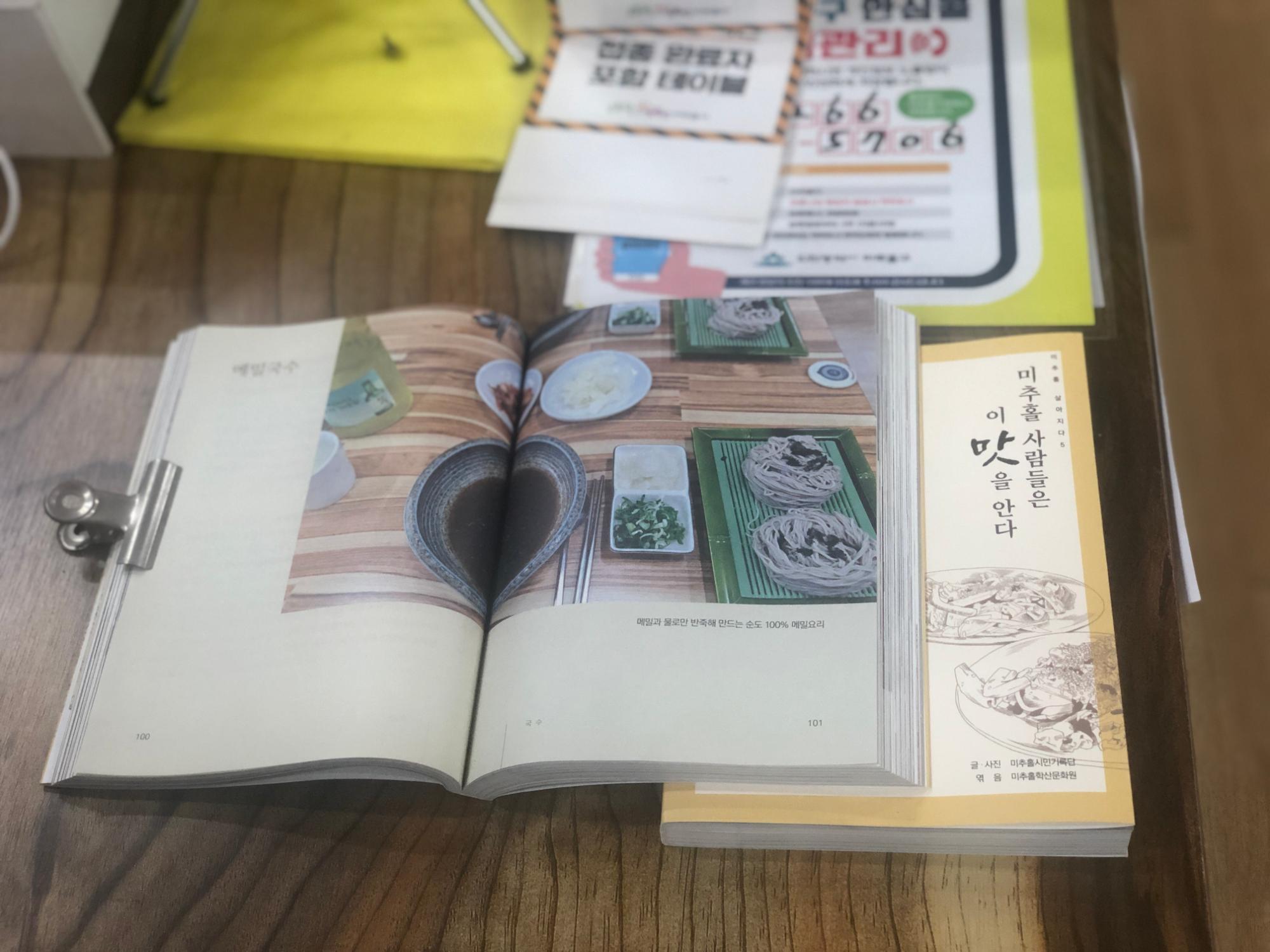 마루메밀 계산대 옆 쪽에 비치되어 있는 [미추홀, 살아지다5 미추홀 사람들은 이 맛을 안다] 도서의 모습이다.