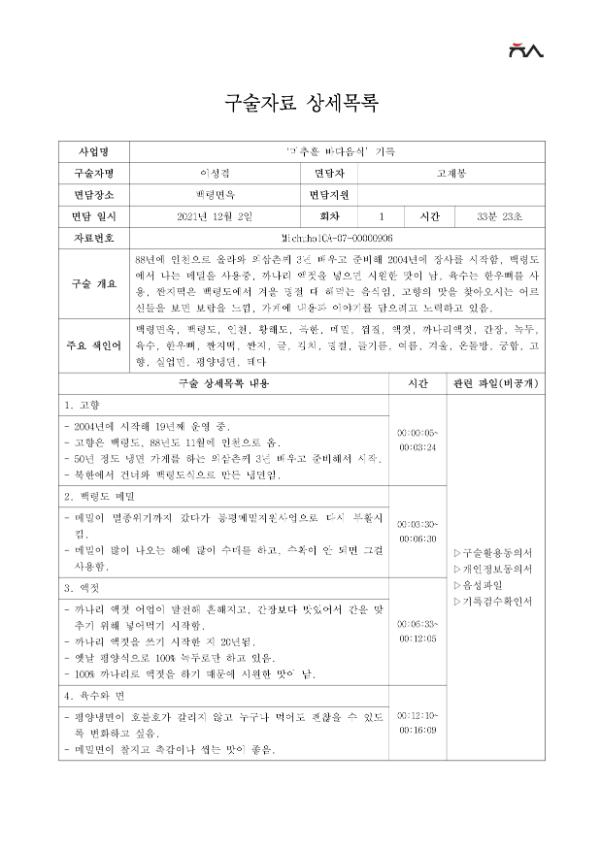 • 구술내용 요약 : 88년에 인천으로 올라와 외삼촌께 3년 배우고 준비해 2004년에 장사를 시작함, 백령도에서 나는 메밀을 사용중, 까나리 액젓을 넣으면 시원한 맛이 남, 육수는 한우뼈를 사용, 짠지떡은 백령도에서 겨울 명절 때 해먹는 음식임, 고향의 맛을 찾아오시는 어르신들을 보면 보람을 느낌, 가게에 내용과 이야기를 담으려고 노력하고 있음.