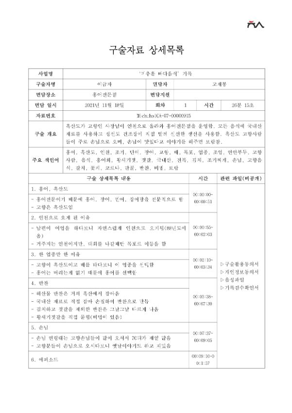 • 구술내용 요약 : 흑산도가 고향인 사장님이 인천으로 올라와 홍어전문점을 운영함. 모든 음식에 국내산재료를 사용하고 생선도 건조장에 직접 말려 신선한 생선을 사용함. 흑산도 고향사람들이 주로 손님으로 오며, 손님이 맛있다고 이야기를 해주면 보람참.