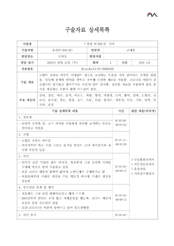 • 구술내용 요약 : 고향이 전라도 여수인 사장님이 신선한 고기라는 이름을 지어 선어라는 가게를 열었음. 당일에 판매할 민어를 경매로 구매해 신선한 재료를 사용함. 코로나로 매출이 감소했지만 잊지않고 찾아주시는 손님이 있어 감사함. 신선한 재료를 사용하여 좋은 음식을 제공하는 부분에 대한 자부심이 있음.