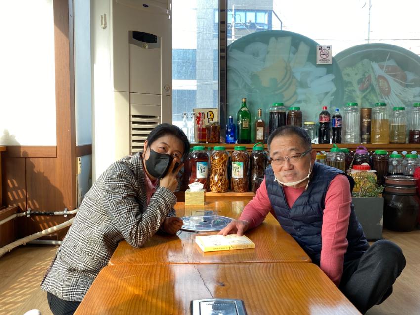 [미추홀, 살아지다5 미추홀 사람들은 이 맛을 안다] 중 메밀국수 부분을 구술해주신 마루메밀 박형일 사장님께 당시 면담을 진행했던 시민기록단 이혜숙님이 도서를 전달한 모습이다.