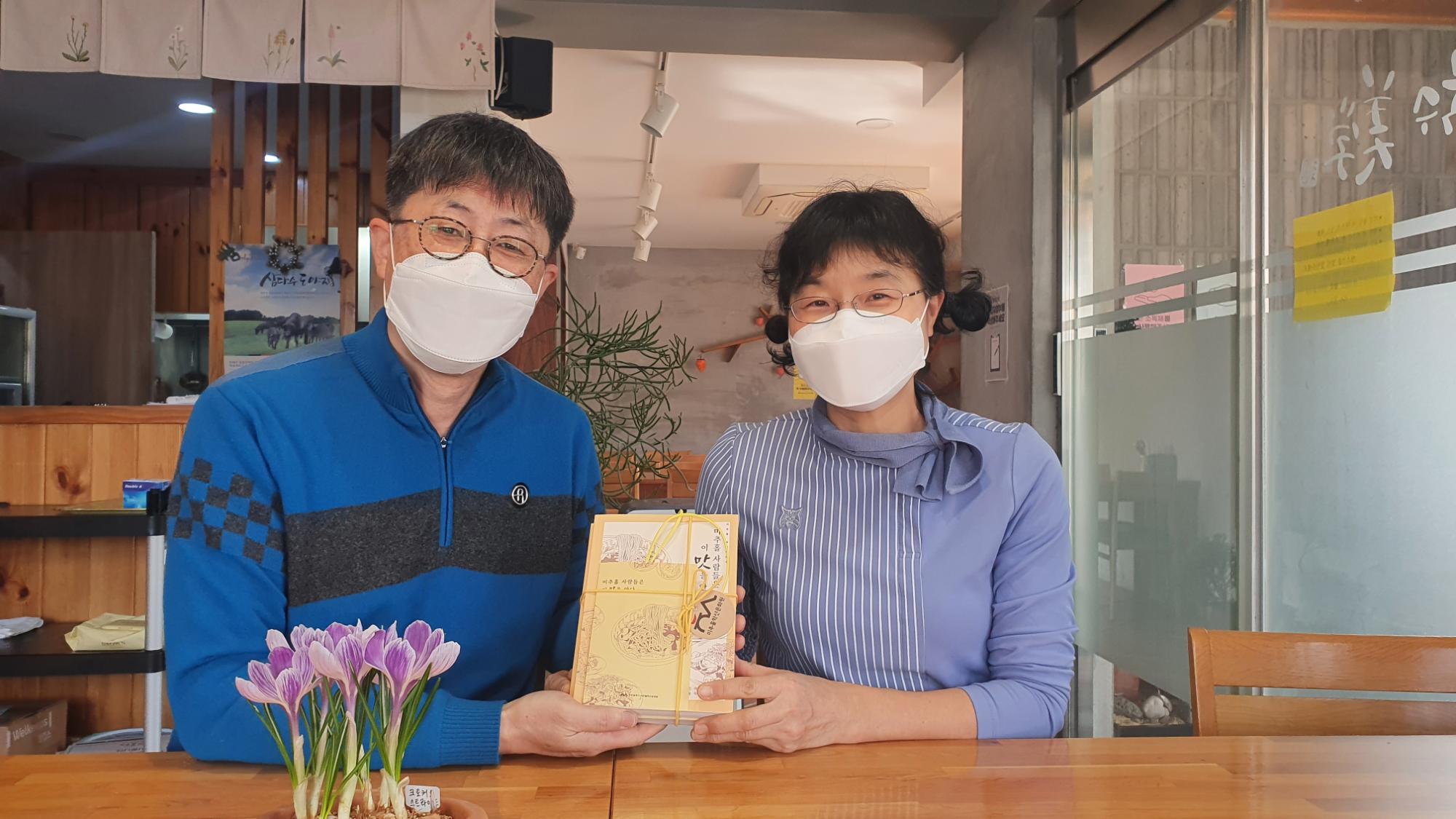 [미추홀, 살아지다5 미추홀 사람들은 이 맛을 안다] 중 사골칼국수 부분을 구술해주신 칼국수미학 김승준, 김미경 사장님께 당시 면담을 진행했던 시민기록단 정지선님이 도서를 전달하여 책과 함께 촬영한 사진이다.