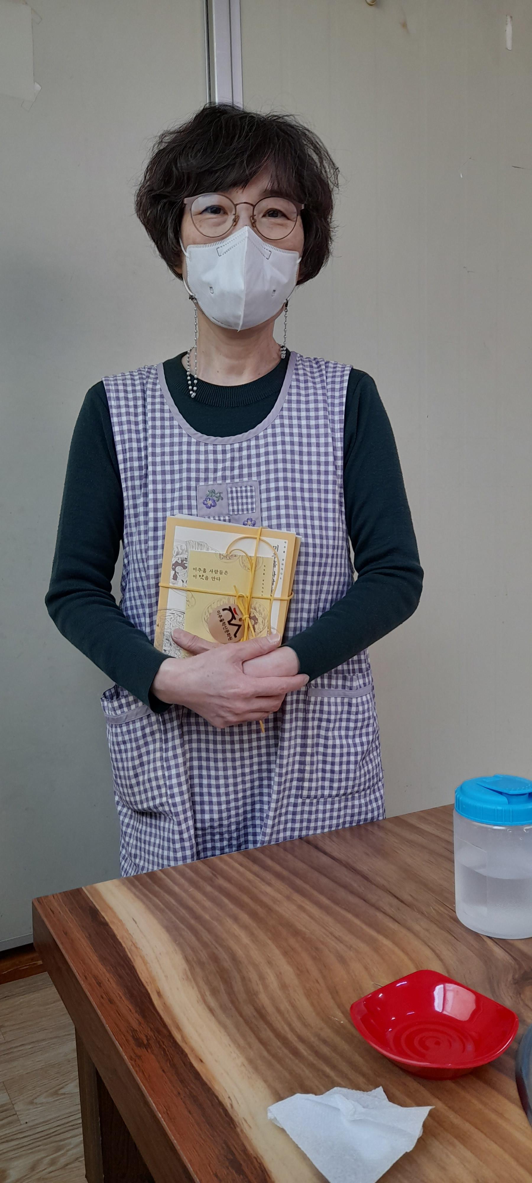 [미추홀, 살아지다5 미추홀 사람들은 이 맛을 안다] 중 바지락(가리비)칼국수 부분을 구술해주신 가리비칼국수 이기례 사장님께 당시 면담을 진행했던 시민기록단 표기자님이 도서를 전달하여 책과 함께 사진을 찍었다.