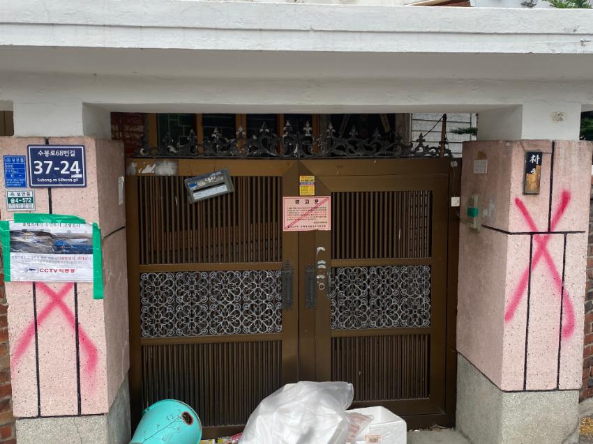 주택 입구에는 재개발정비사업조합의 경고문과 불법쓰레기 무단투기 고발조치 안내문이 부착되어 있다.
