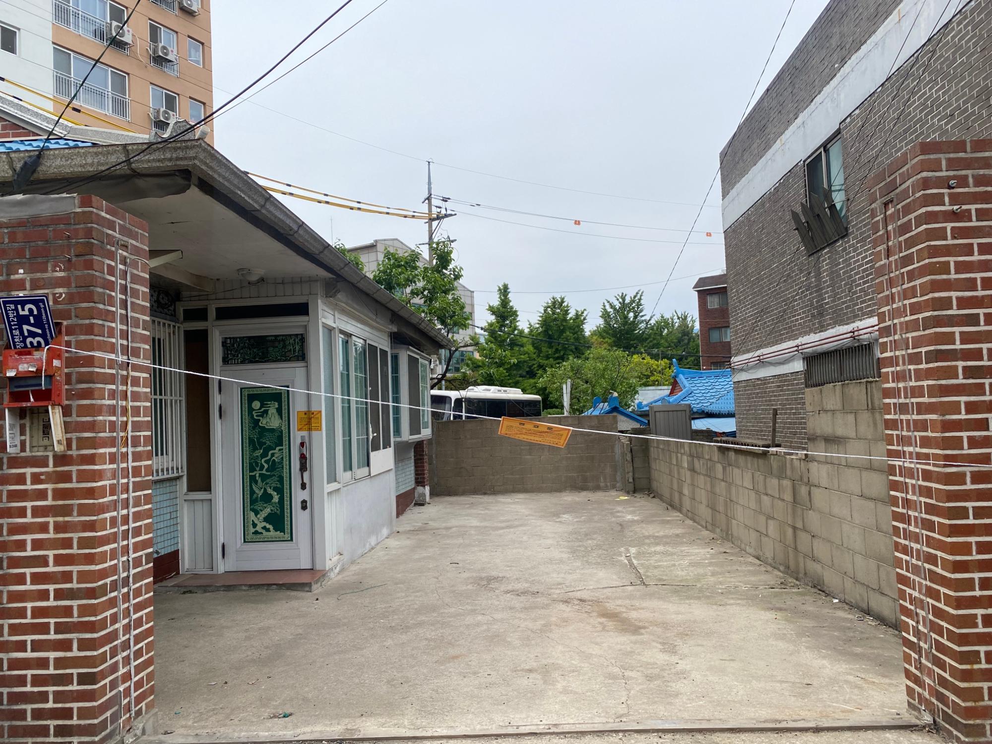주택 입구와 현관문에는 재개발정비사업조합의 경고문이 부착되어 있다.