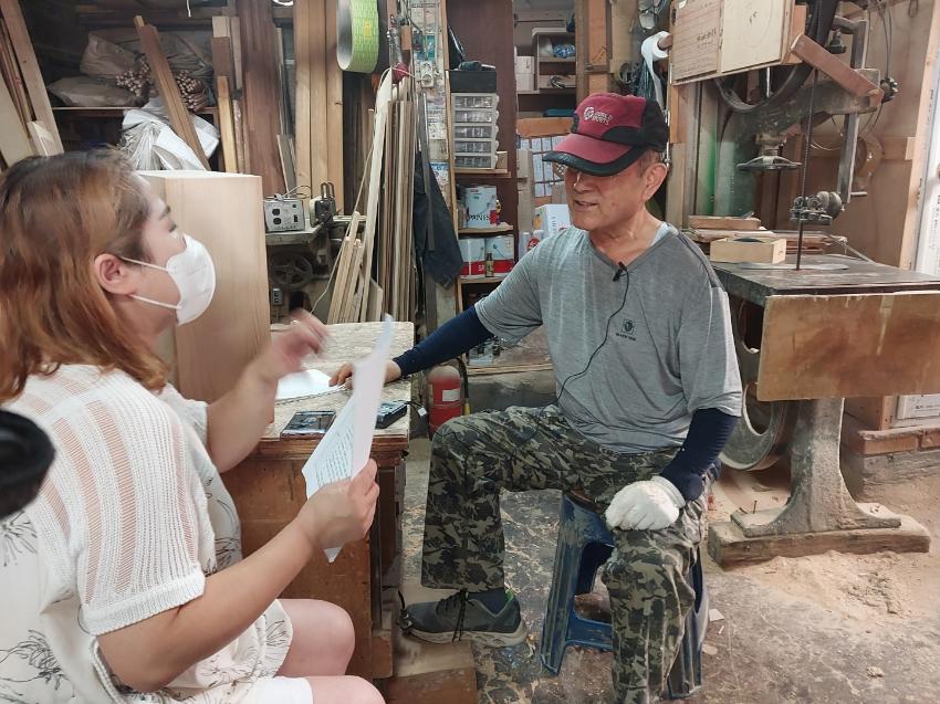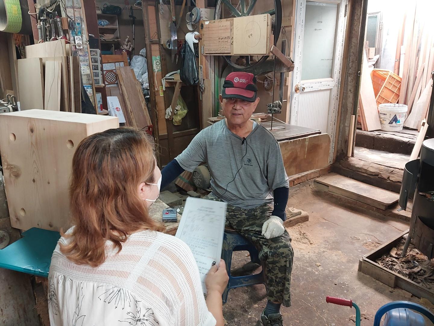 2022년 숭의목공예마을 기록을 위해 미추홀시민기록단 정은주님이 신정목공예 사장님을 인터뷰 하는 모습이다. 목공 직업을 주제로 사장님의 삶을 함께 기록하였다.