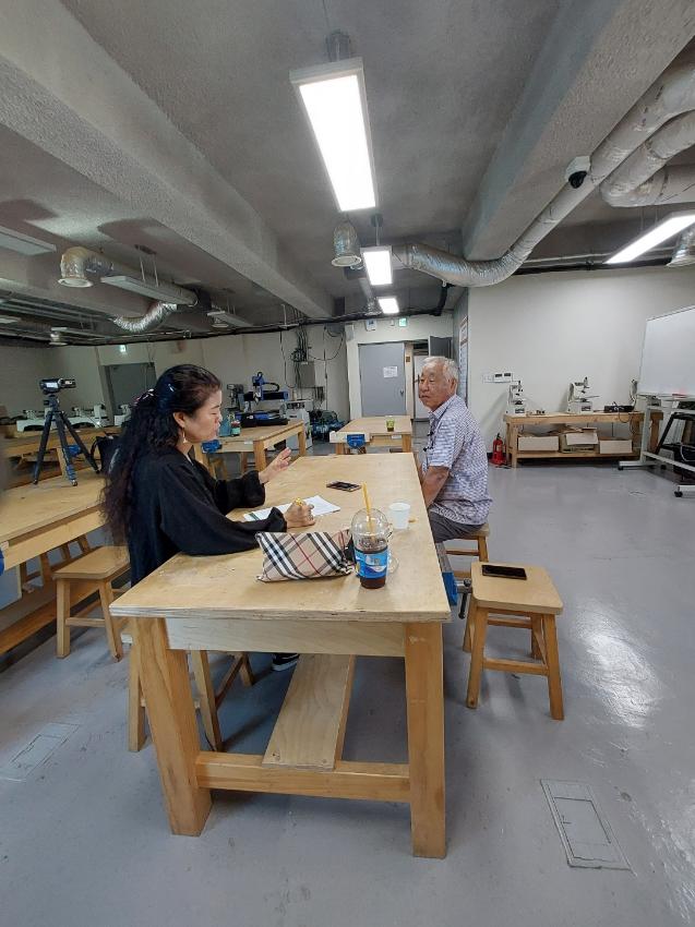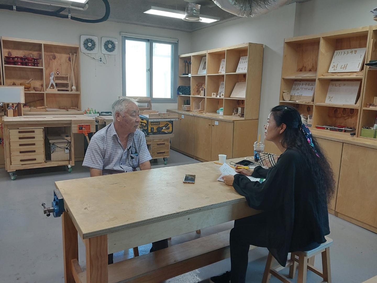 2022년 숭의목공예마을 기록을 위해 미추홀시민기록단 이혜숙님이 서울공예사 사장님을 인터뷰하는 모습이다. 목공 직업을 주제로 사장님의 삶을 함께 기록하였다.