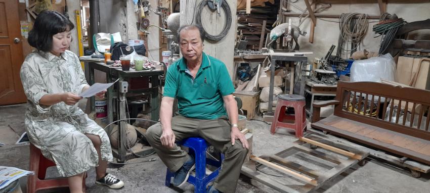 2022년 숭의목공예마을 기록을 위해 미추홀시민기록단 허은영님이 미추홀공예사 사장님을 인터뷰하는 모습이다. 목공 직업을 주제로 사장님의 삶을 함께 기록하였다.