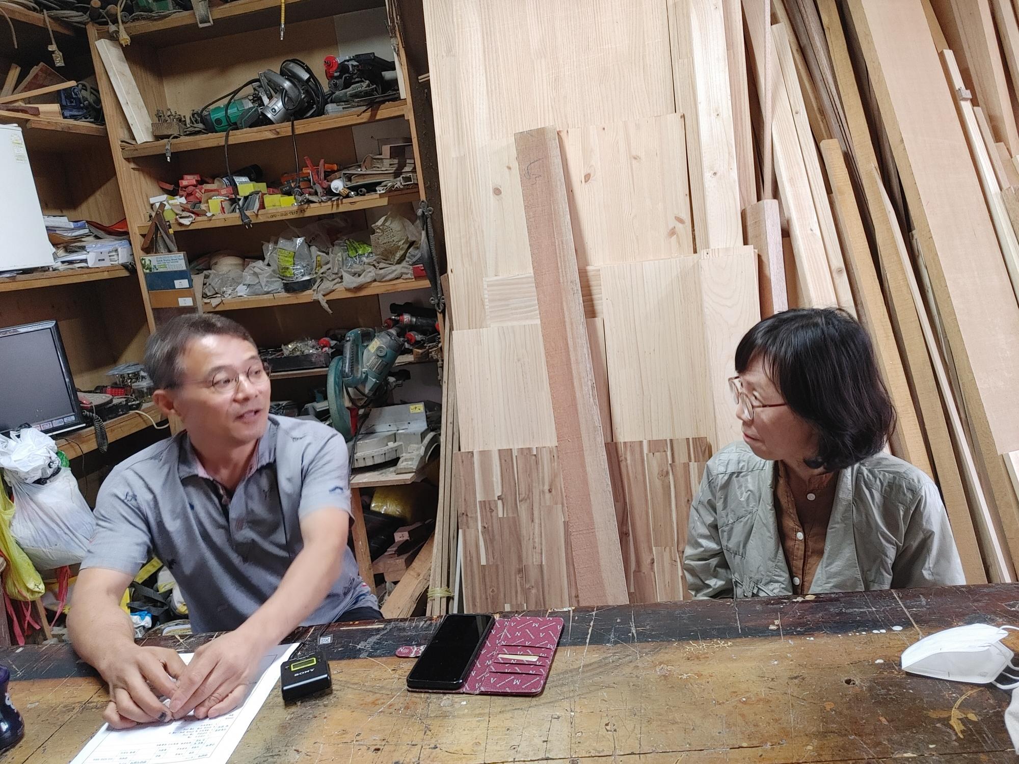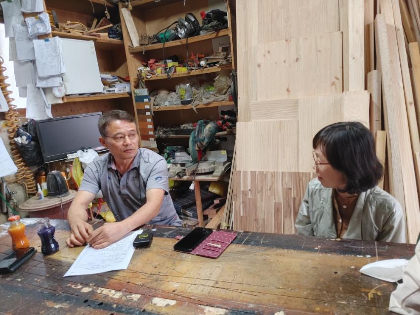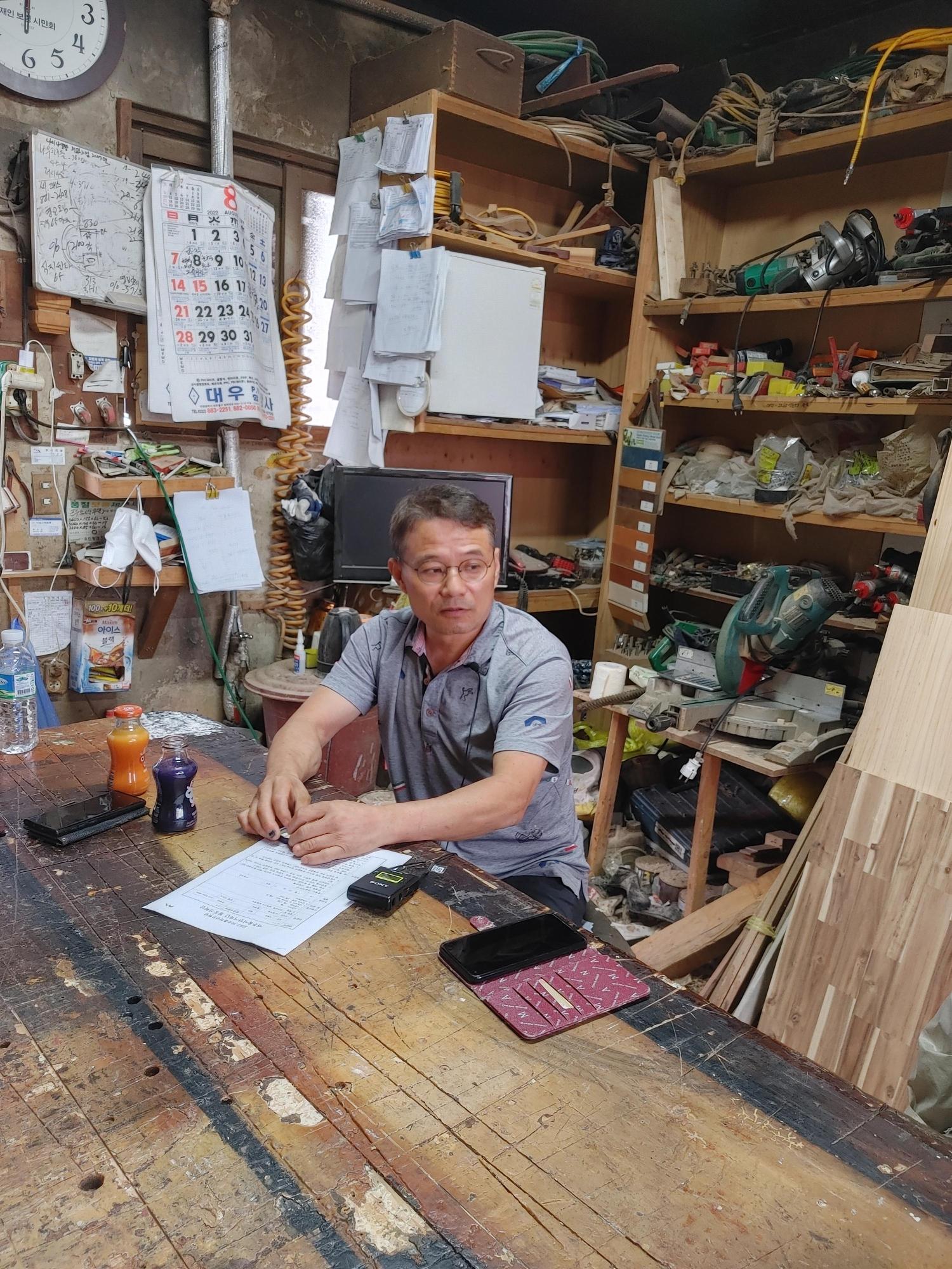 2022년 숭의목공예마을 기록을 위해 미추홀시민기록단 표기자가 보령목공 이복섭 사장을 인터뷰하는 모습이다. 목공 직업을 주제로 구술자의 삶을 함께 기록하였다.