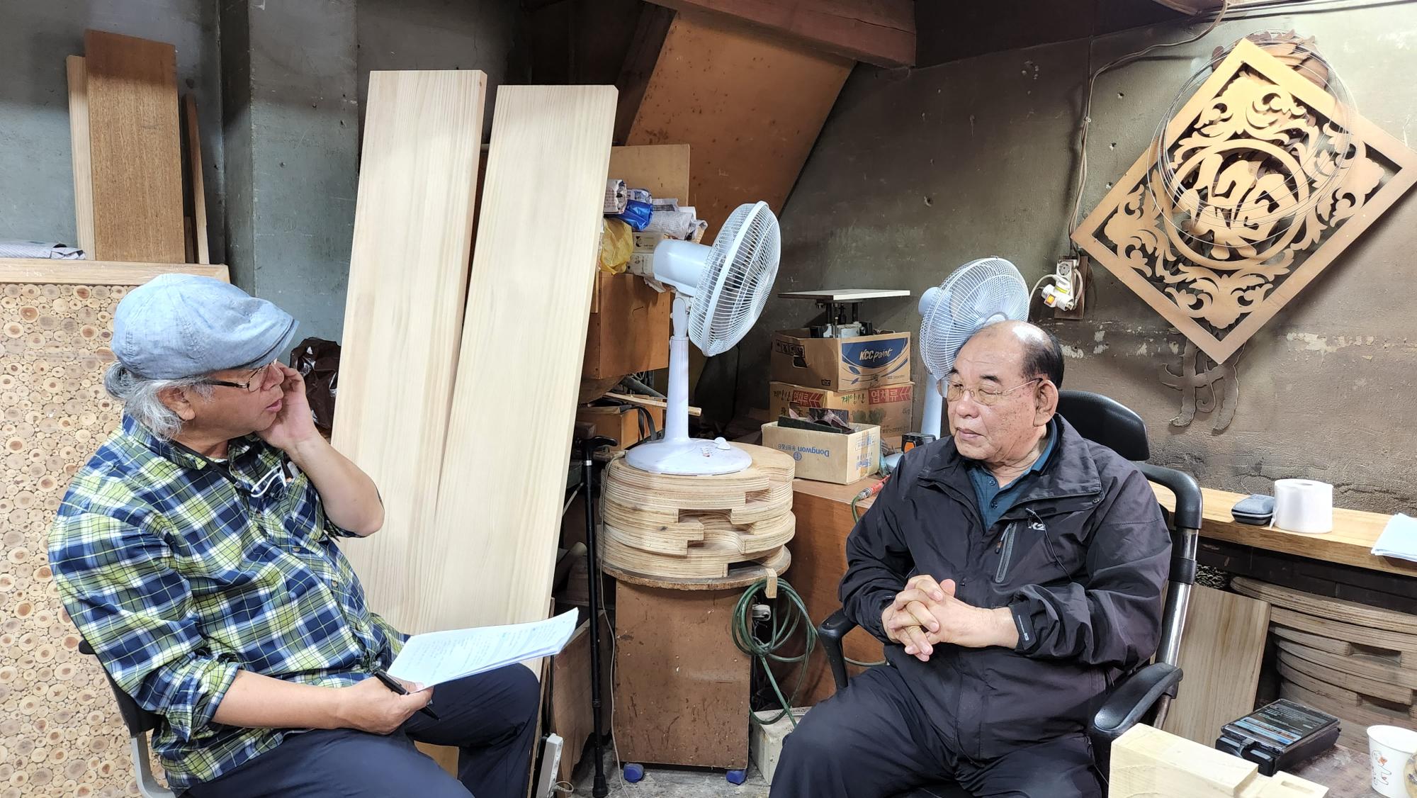 2022년 숭의목공예마을 기록을 위해 미추홀시민기록단 김용경이 인일조각 진교욱 사장을 인터뷰하는 모습이다. 목공 직업을 주제로 구술자의 삶을 함께 기록하였다.
