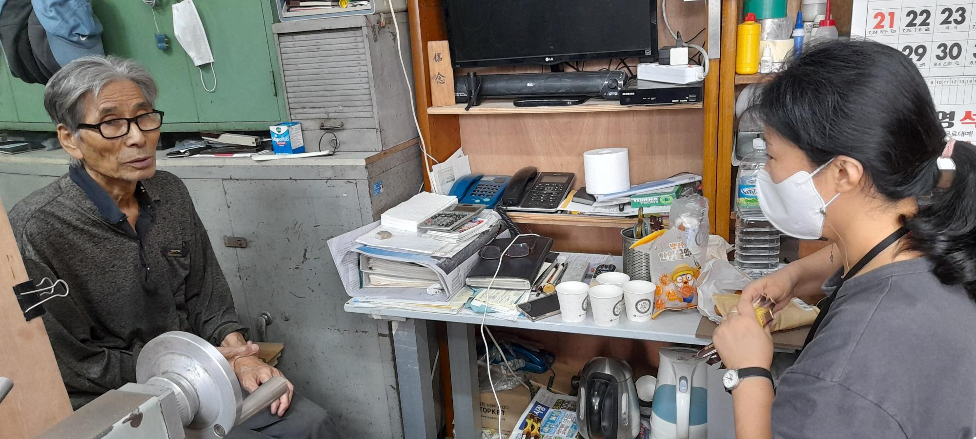 2022년 숭의목공예마을 기록을 위해 미추홀시민기록단 정지선님이 유성톱연마 사장님을 인터뷰하는 모습이다. 직업을 주제로 사장님의 삶을 함께 기록하였다.