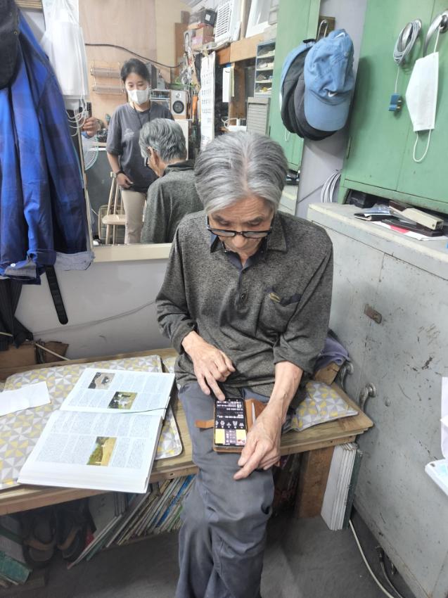 2022년 숭의목공예마을 기록을 위해 미추홀시민기록단 정지선님이 유성톱연마 사장님을 인터뷰하는 모습이다. 직업을 주제로 사장님의 삶을 함께 기록하였다.