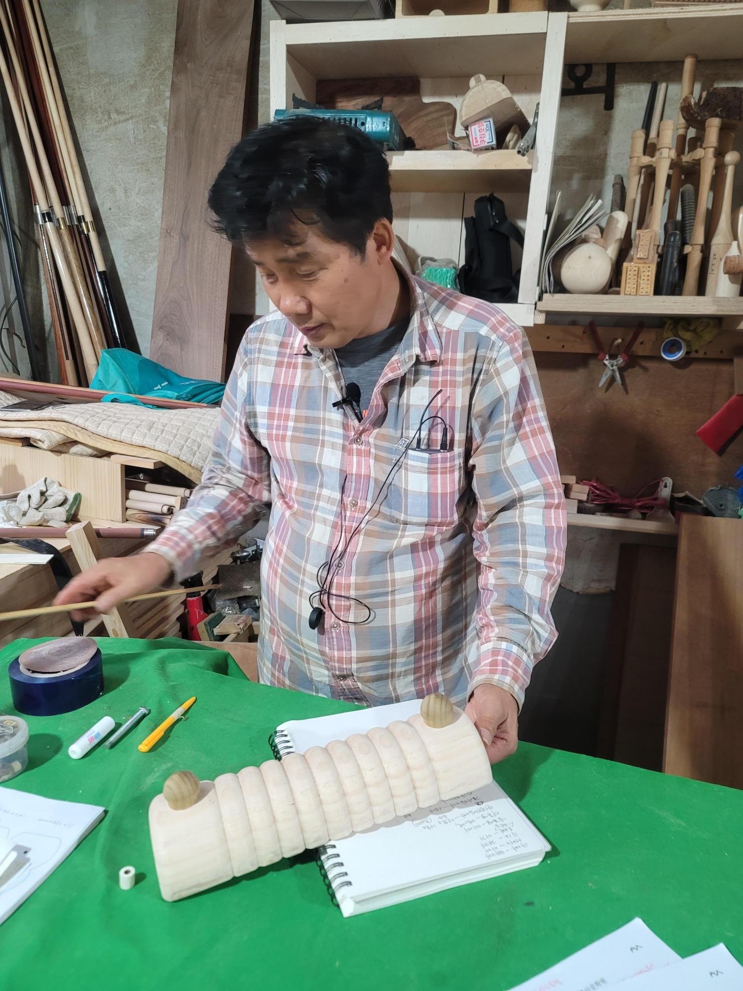 2022년 숭의목공예마을 기록을 위해 대한공예 이철희 사장이 작업물을 설명해주는 모습을 촬영한 사진이다.