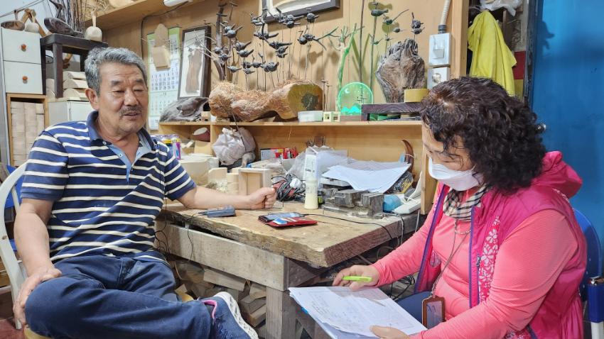| 변경후 내용 | 2022년 숭의목공예마을 기록을 위해 미추홀시민기록단 김순옥이 명진공예사 윤덕환 사장을 인터뷰하는 모습이다. 목공 직업을 주제로 구술자의 삶을 함께 기록하였다. • 촬영장소 : 명진공예사(미추홀구 숭의동) |