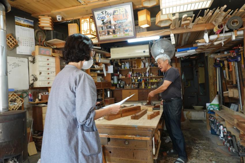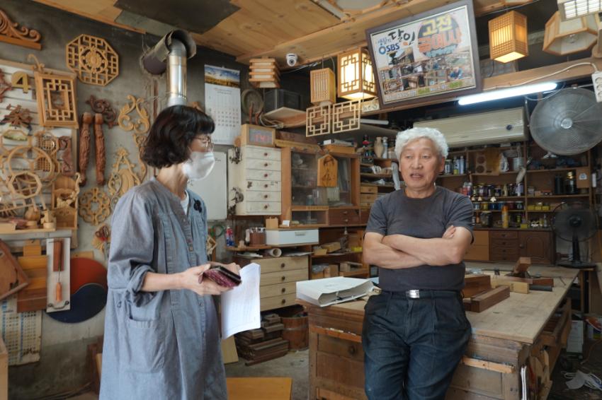 2022년 숭의목공예마을 기록을 위해 미추홀시민기록단 표기자님이 고전공예사 사장님을 인터뷰하는 모습이다. 목공 직업을 주제로 사장님의 삶을 함께 기록하였다.