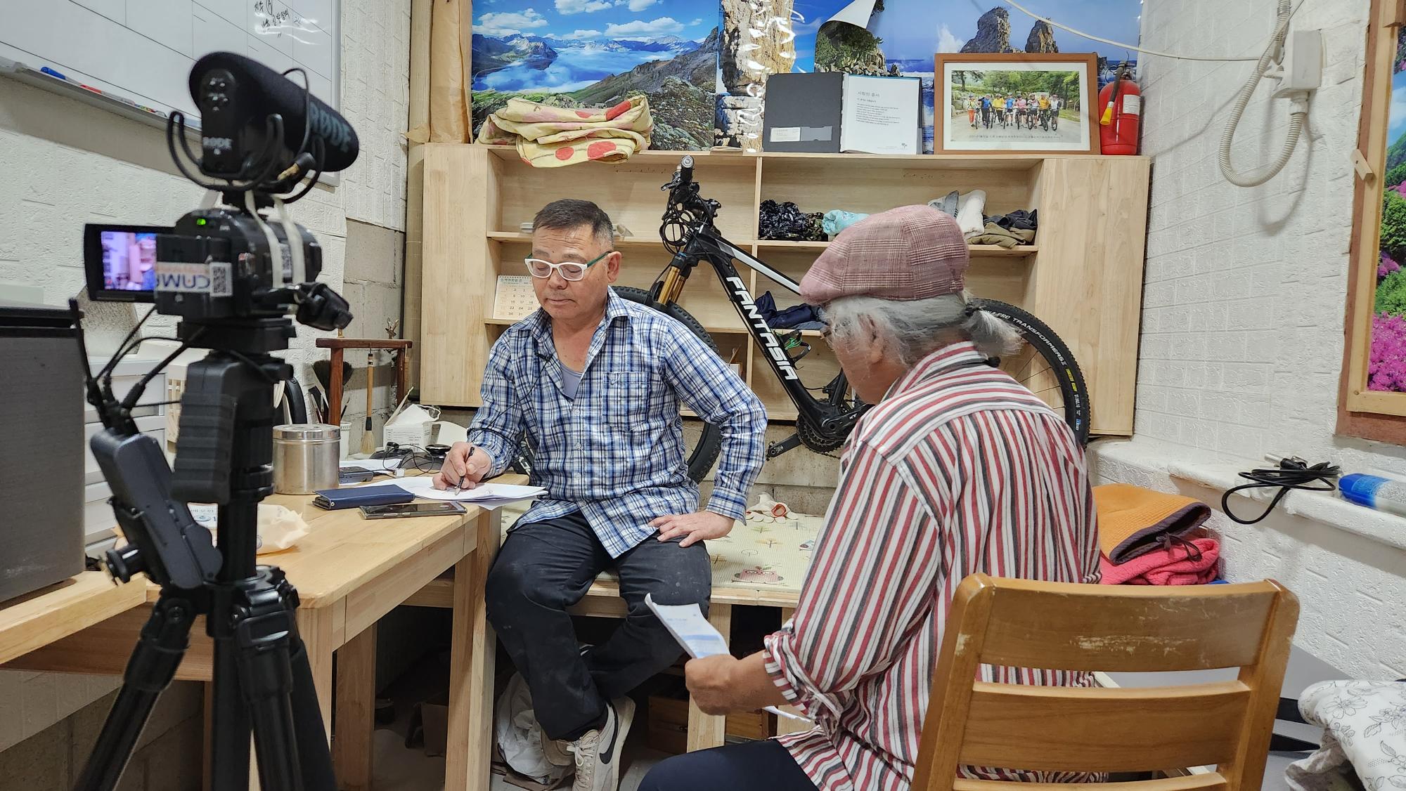 2022년 숭의목공예마을 기록을 위해 미추홀시민기록단 김용경님이 한일 사장님을 인터뷰하는 모습이다. 목공 직업을 주제로 사장님의 삶을 함께 기록하였다.