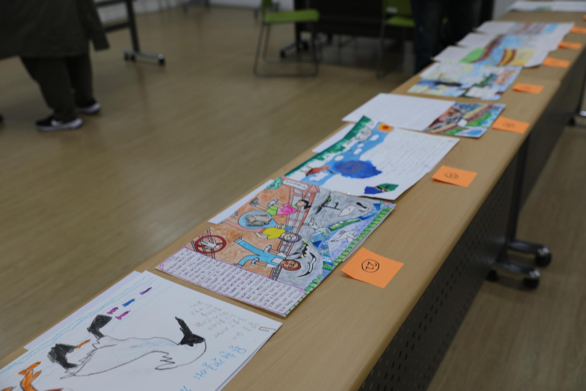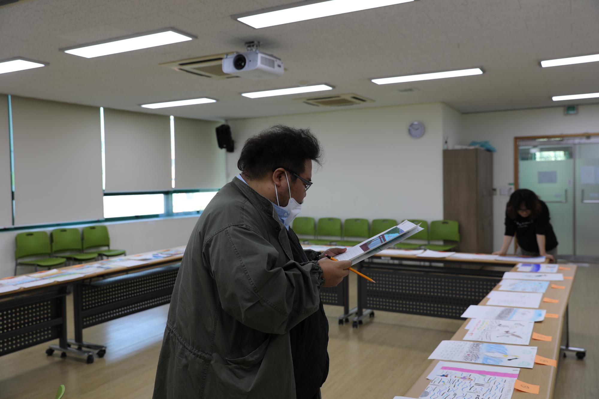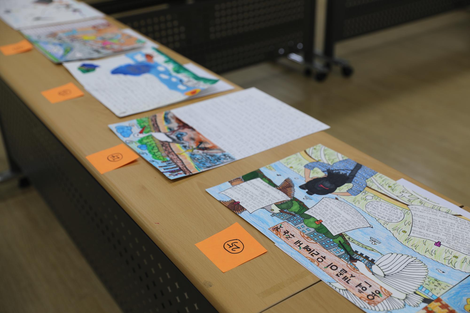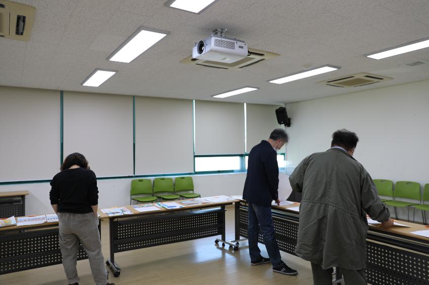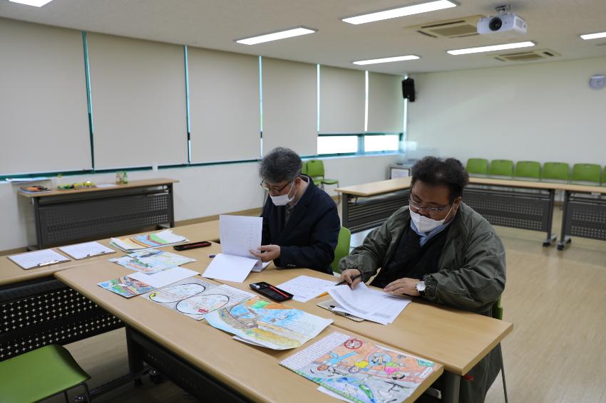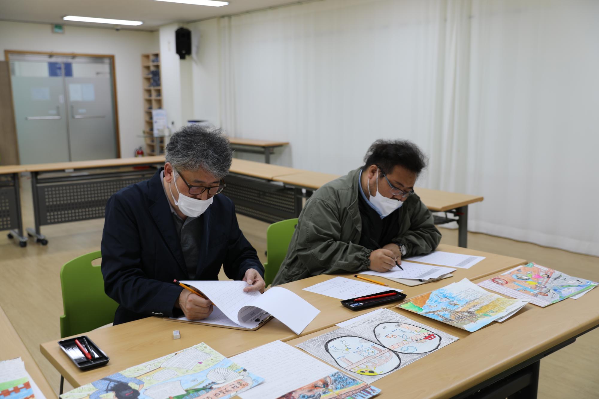 제3회 학산백일장 '사람과 자연이 함께하는 생태적 삶을 꿈꾸며'의 그림일기 부문(초등부)을 심사하는 사진이다.