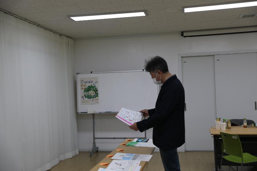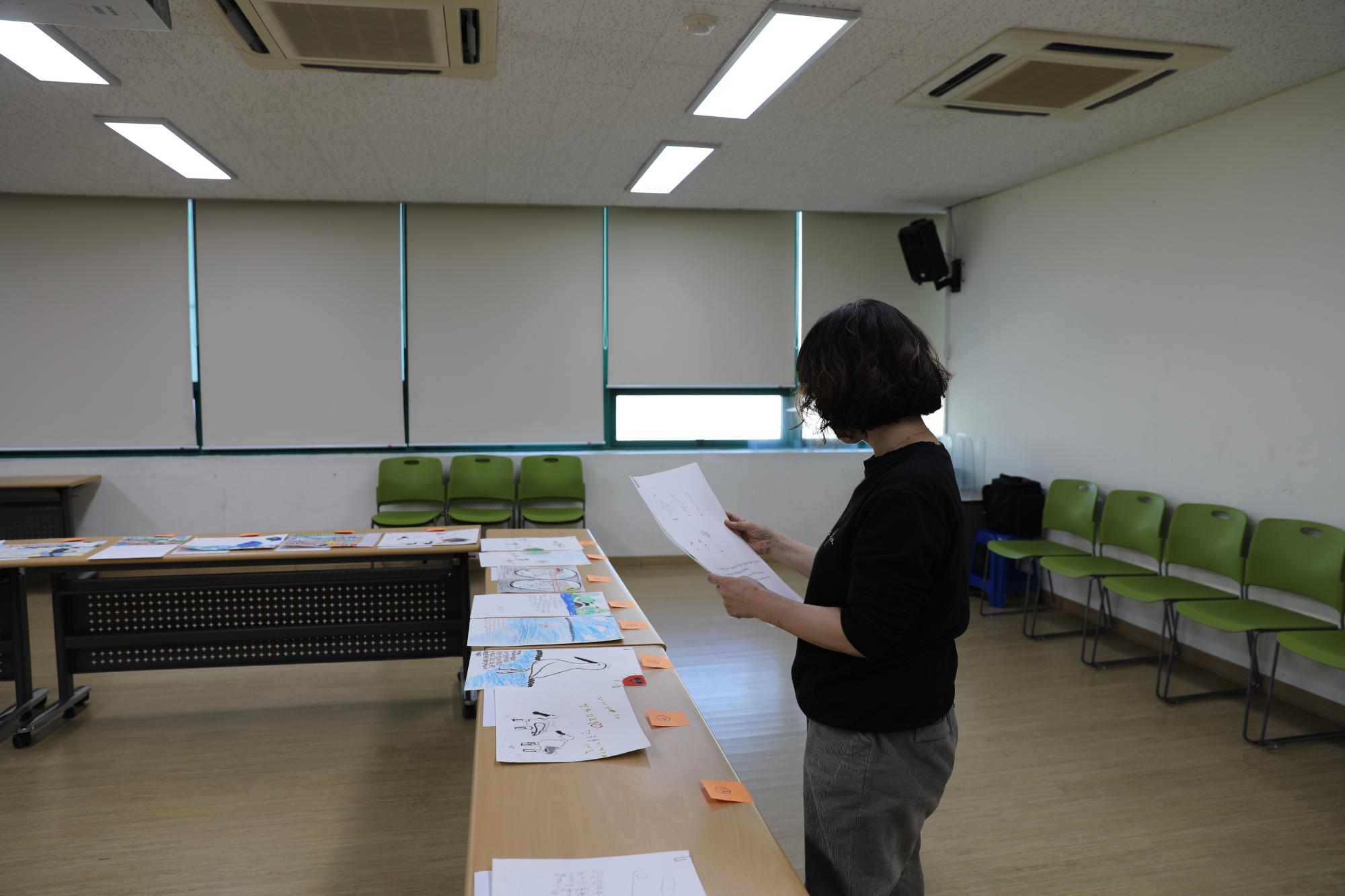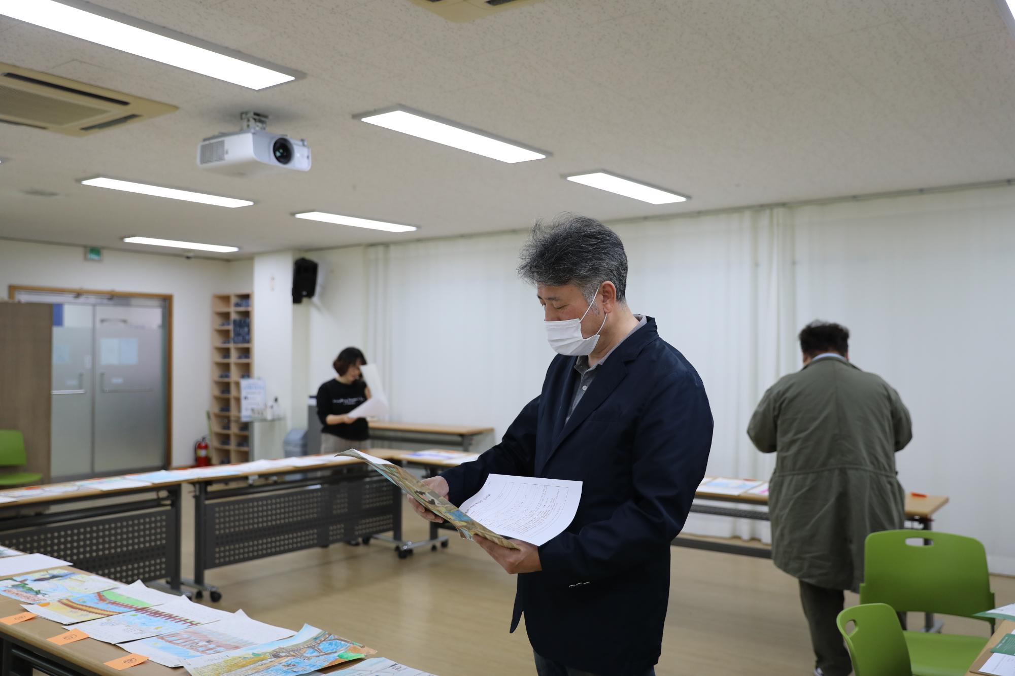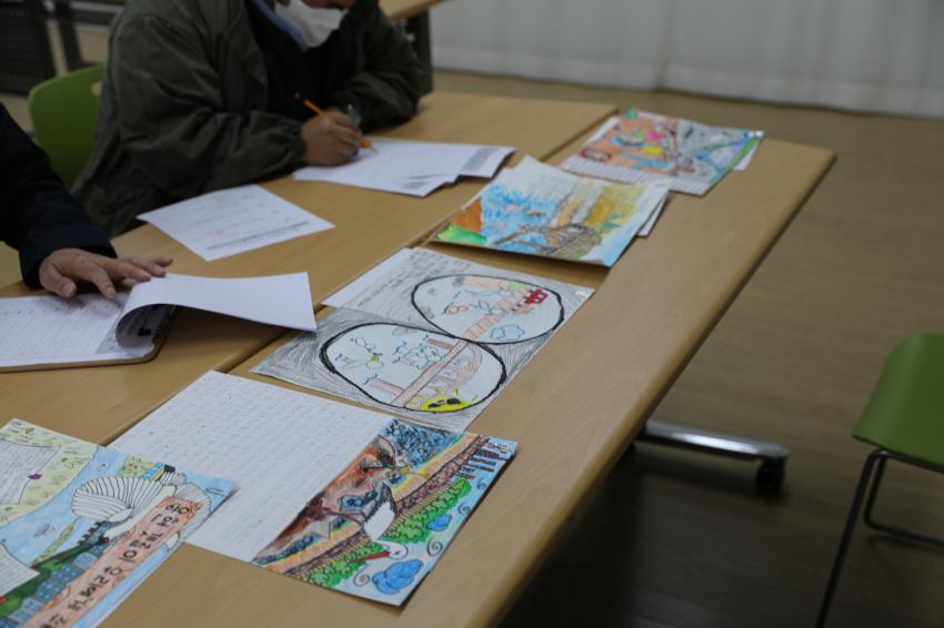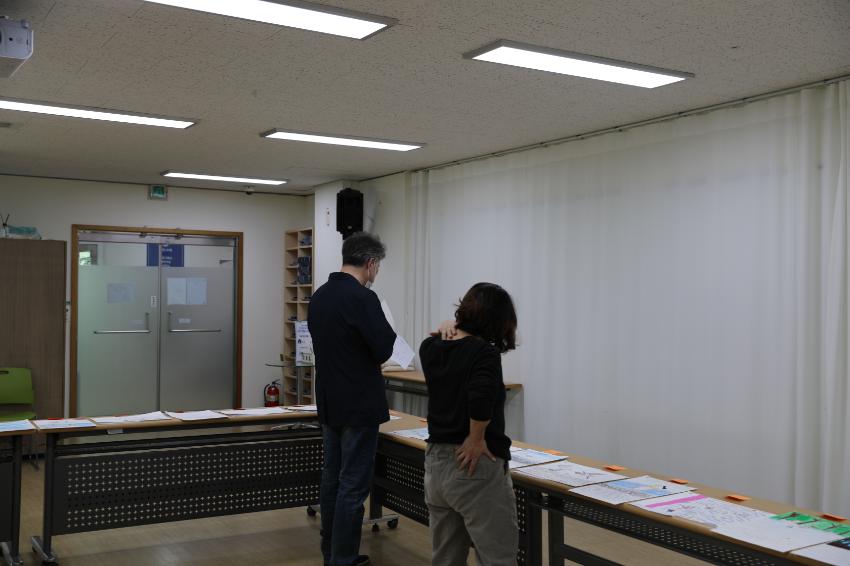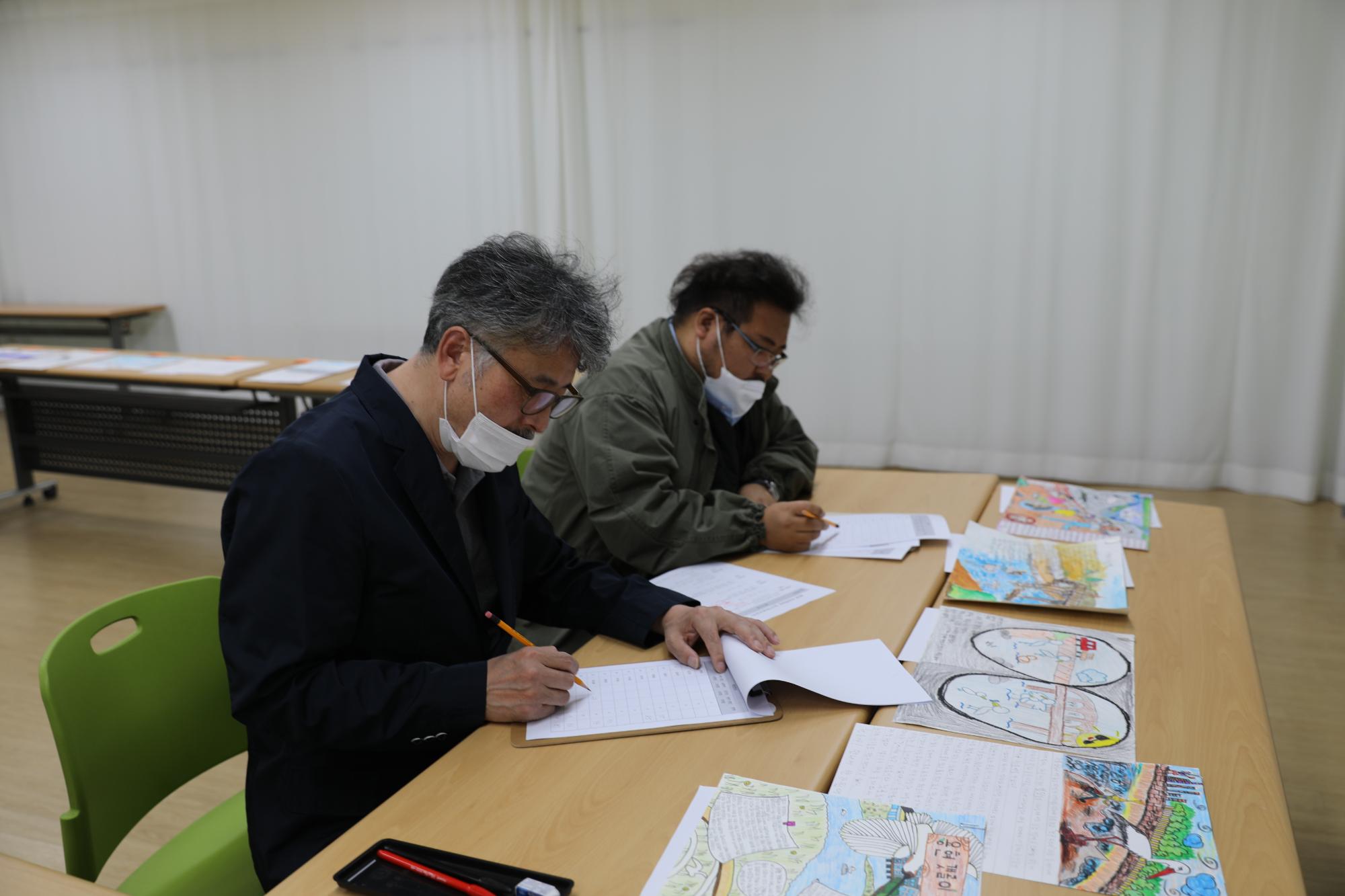 제3회 학산백일장 '사람과 자연이 함께하는 생태적 삶을 꿈꾸며'의 그림일기 부문(초등부)을 심사하는 사진이다.
