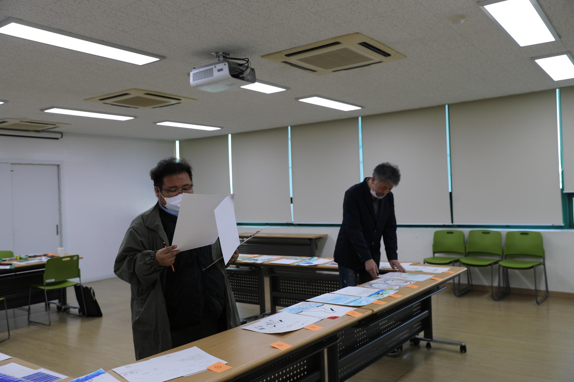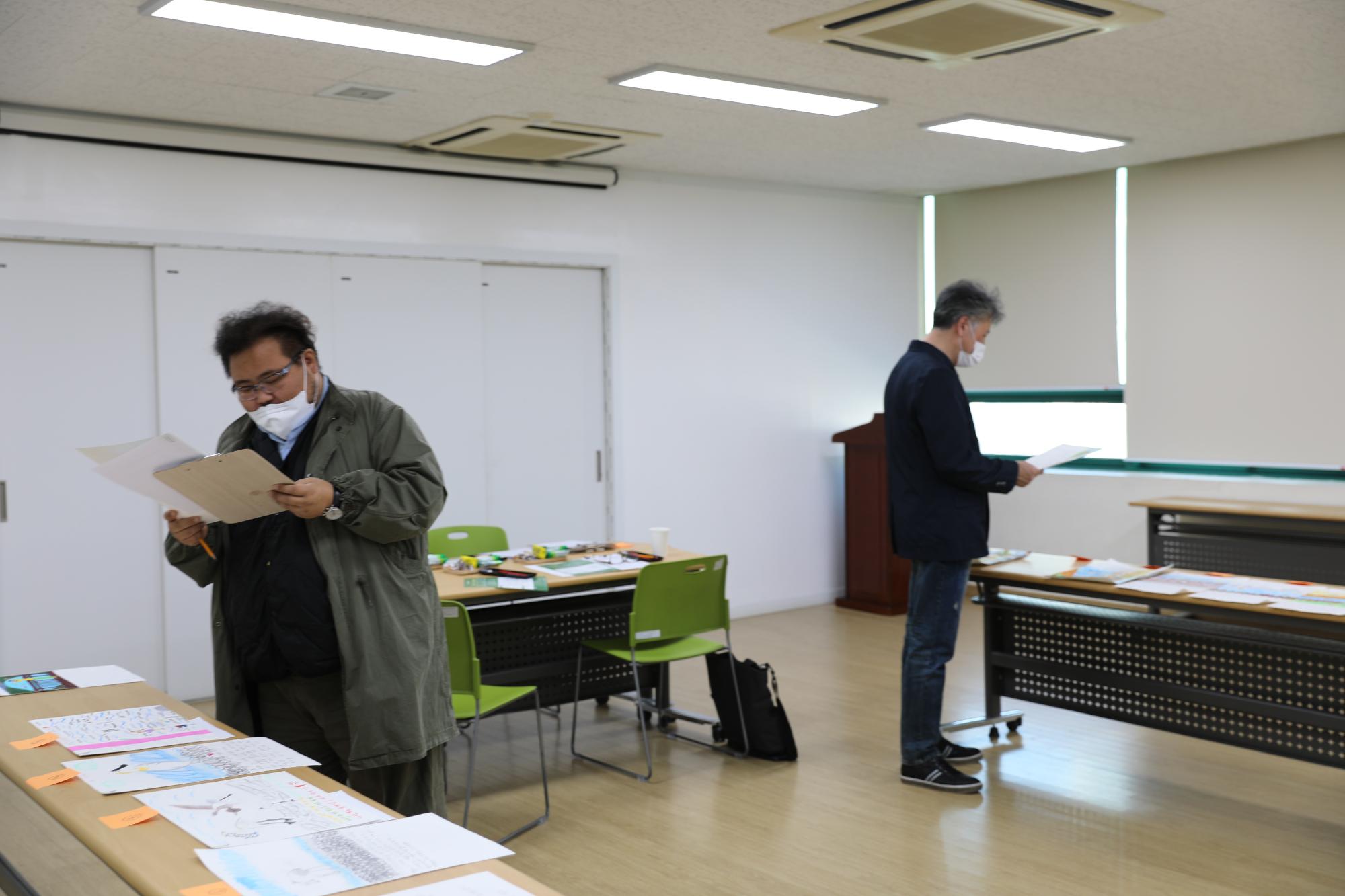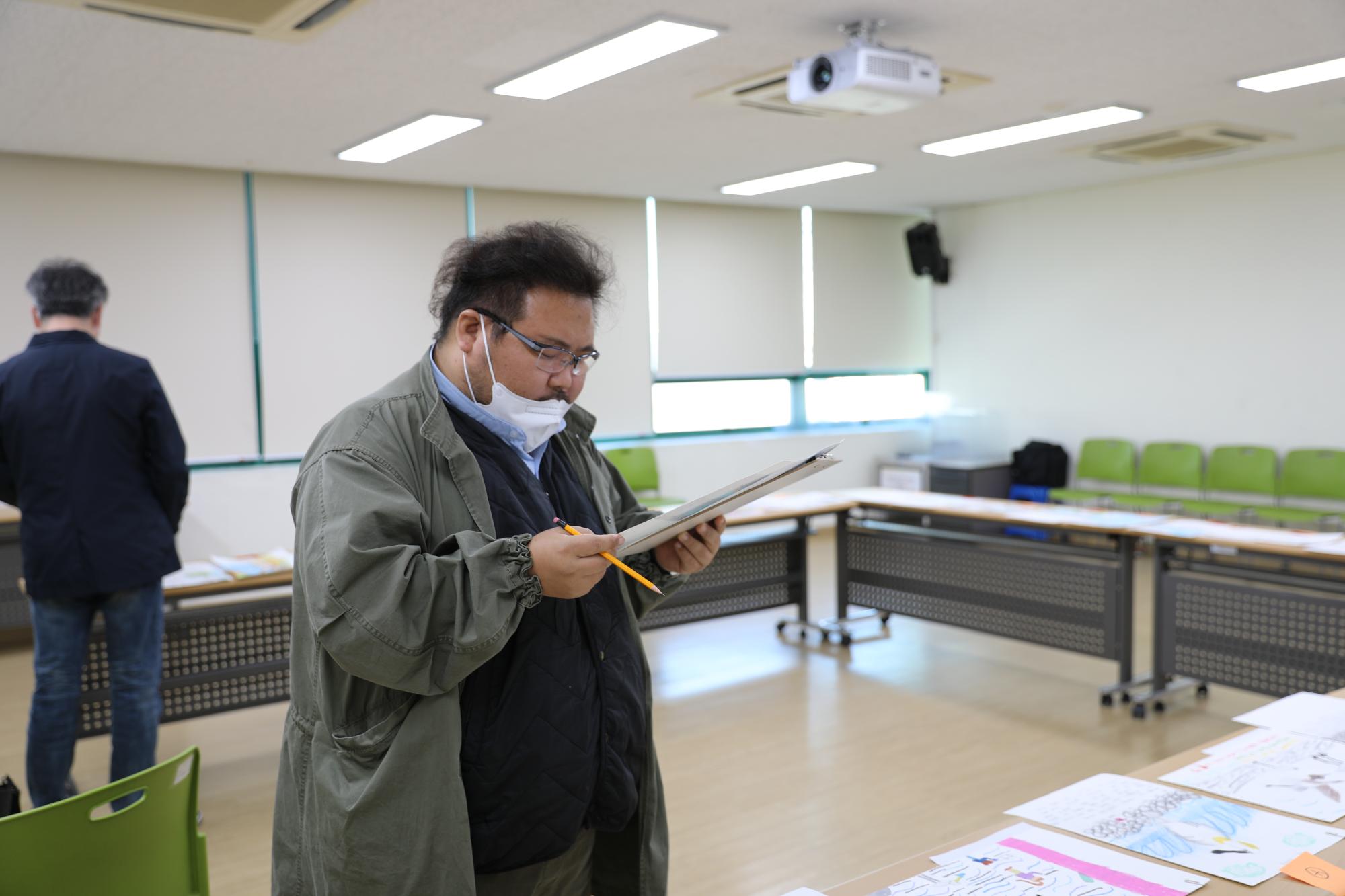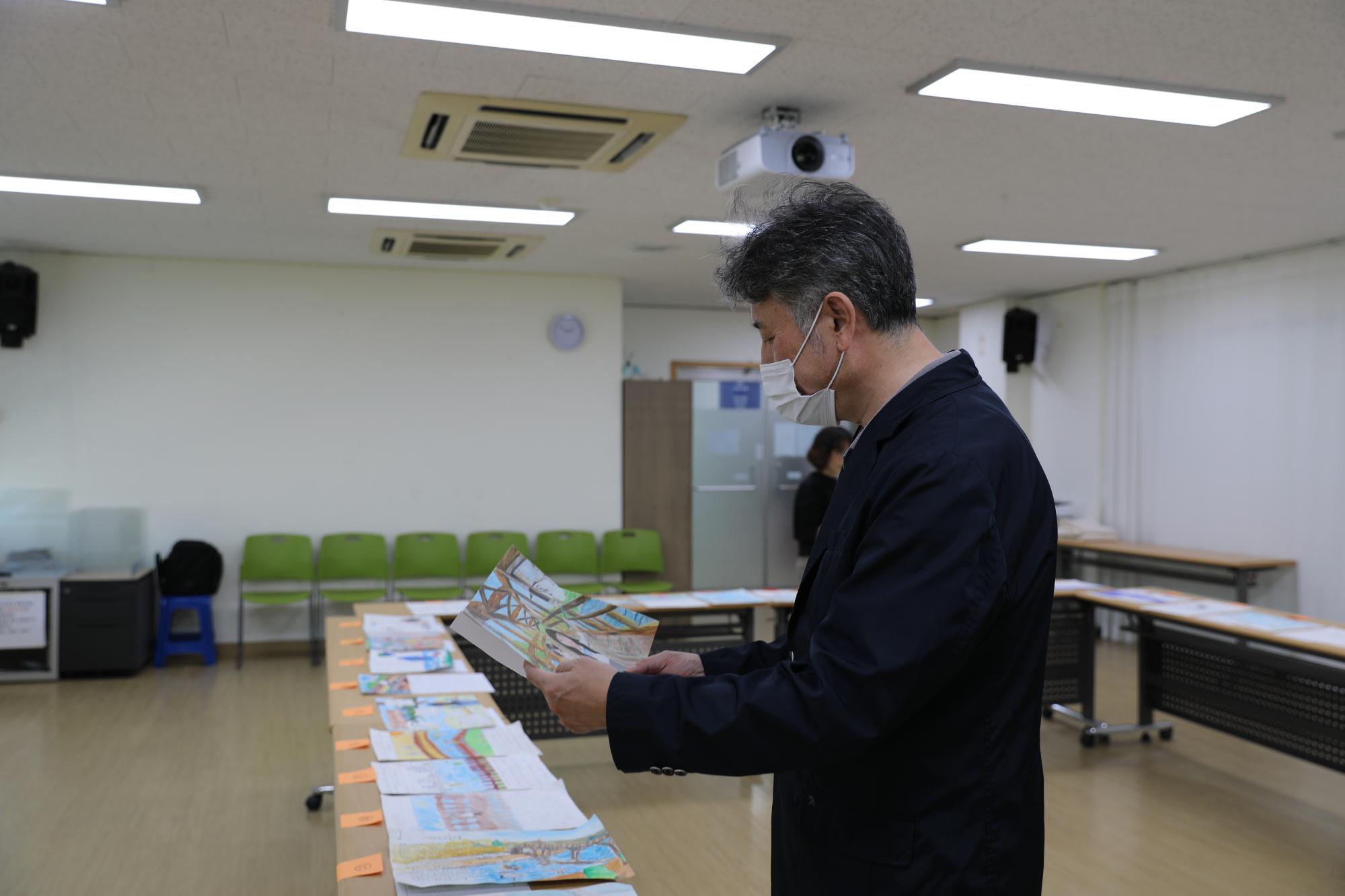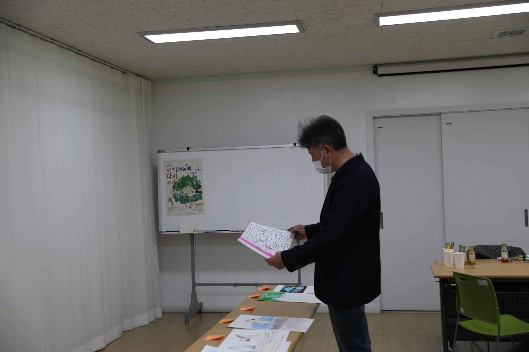 제3회 학산백일장 '사람과 자연이 함께하는 생태적 삶을 꿈꾸며'의 그림일기 부문(초등부)을 심사하는 사진이다.