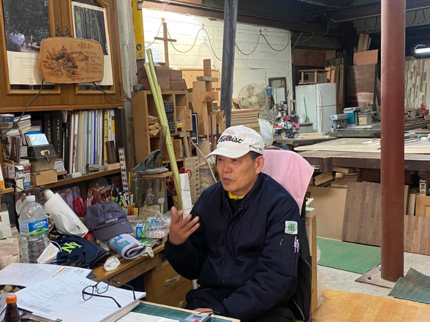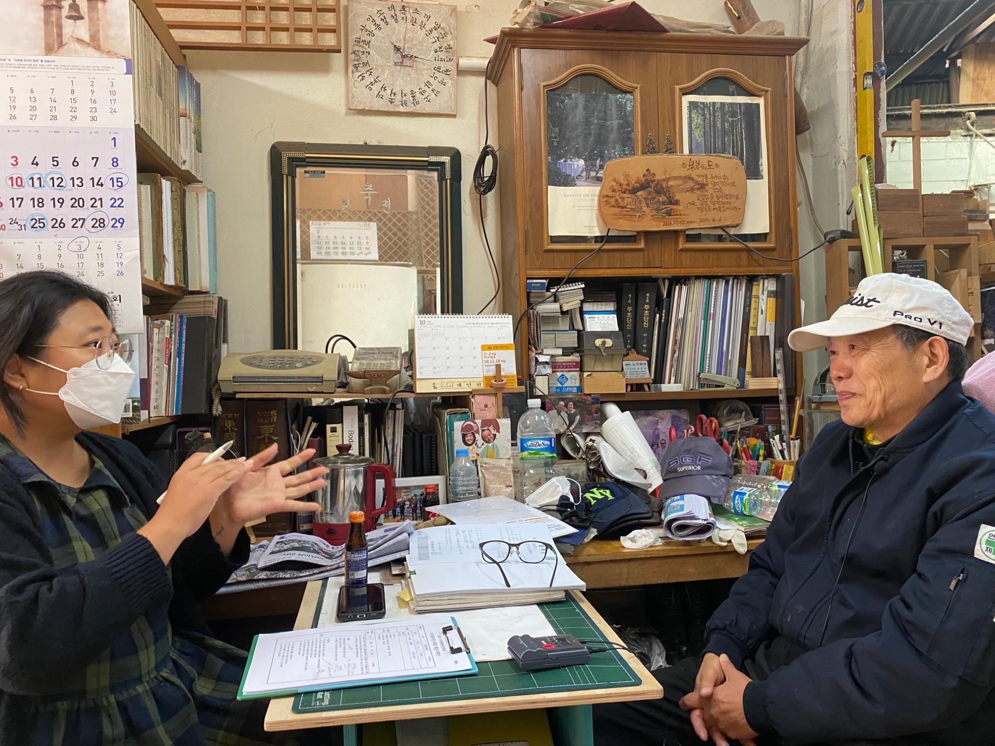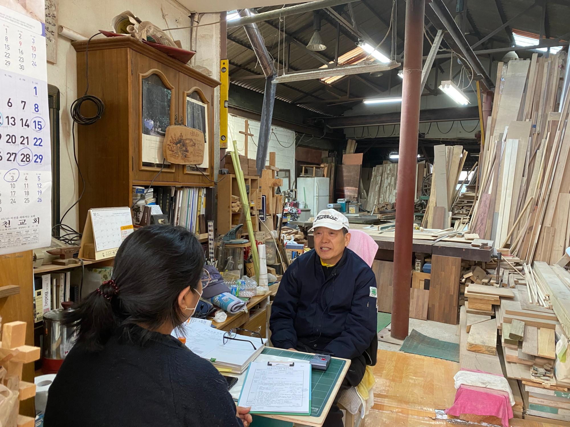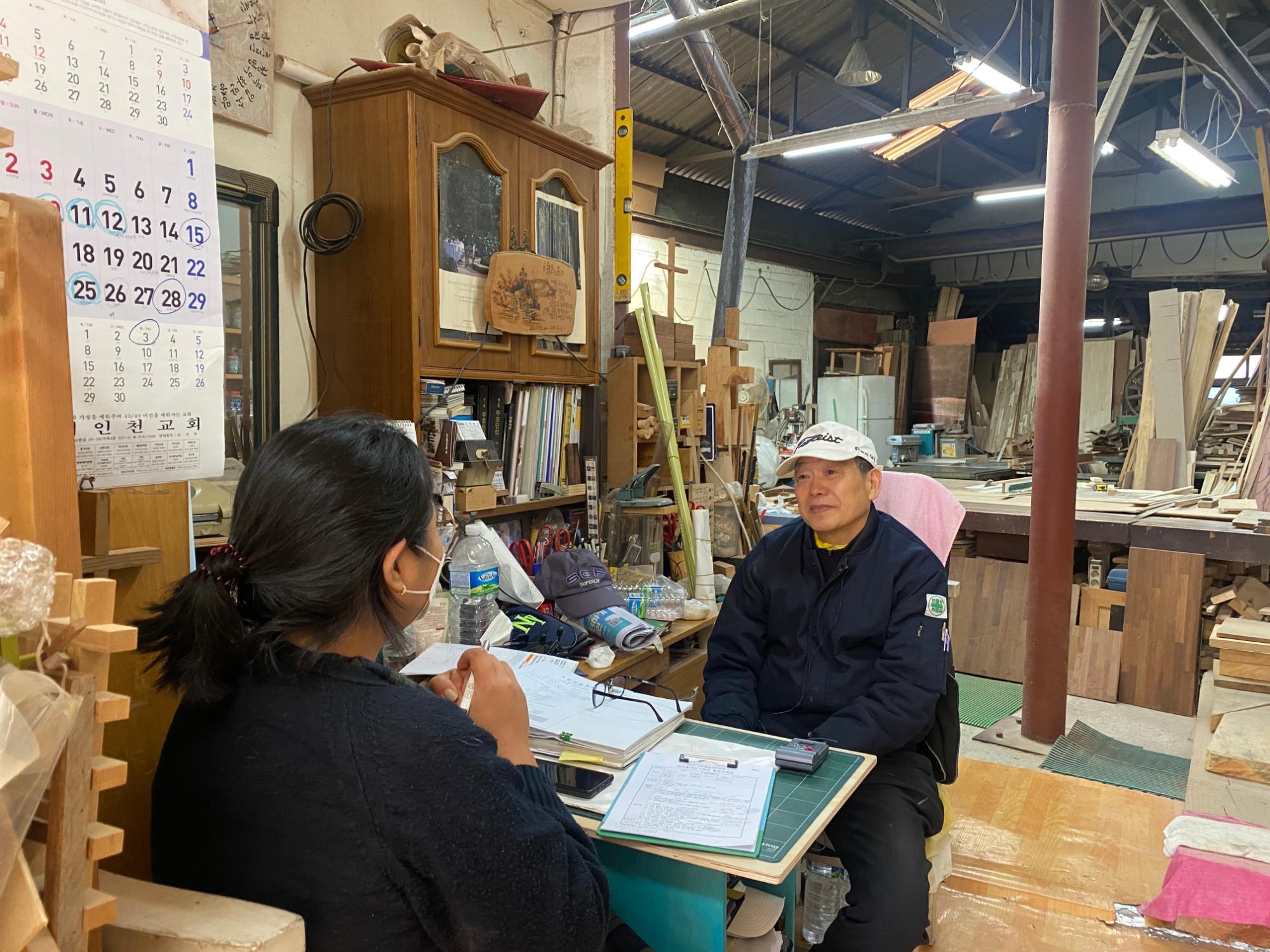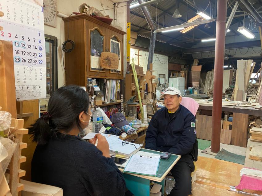 2022년 숭의목공예마을 기록을 위해 미추홀시민기록단 조연희님이 노아목재 김창선 사장님을 인터뷰하는 모습이다. 목공 직업을 주제로 사장님의 삶을 함께 기록하였다.