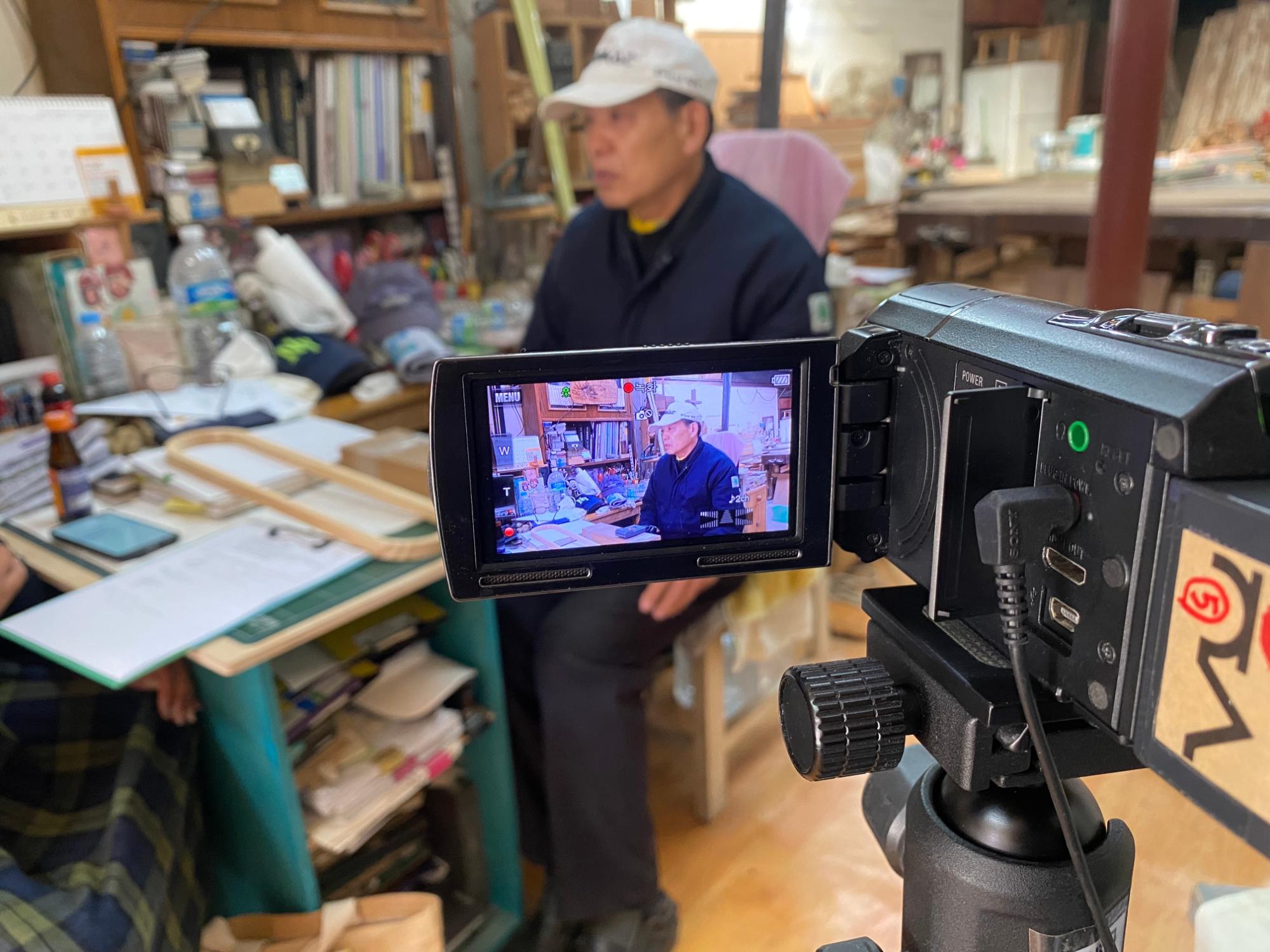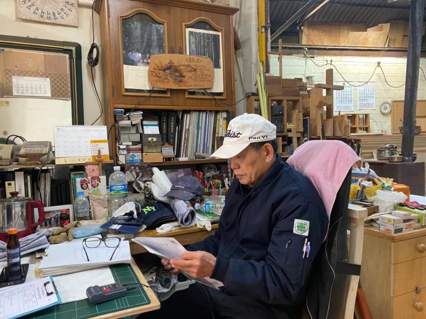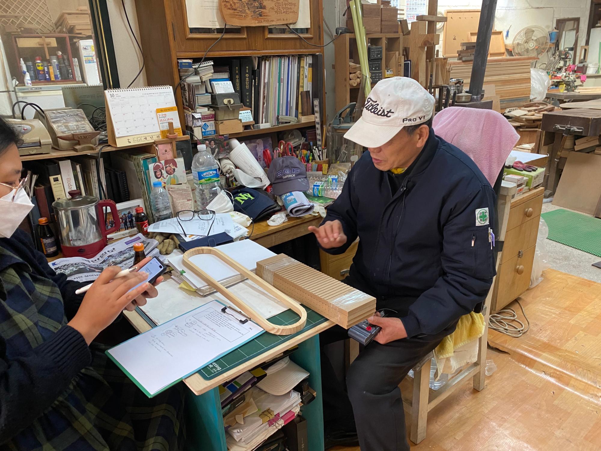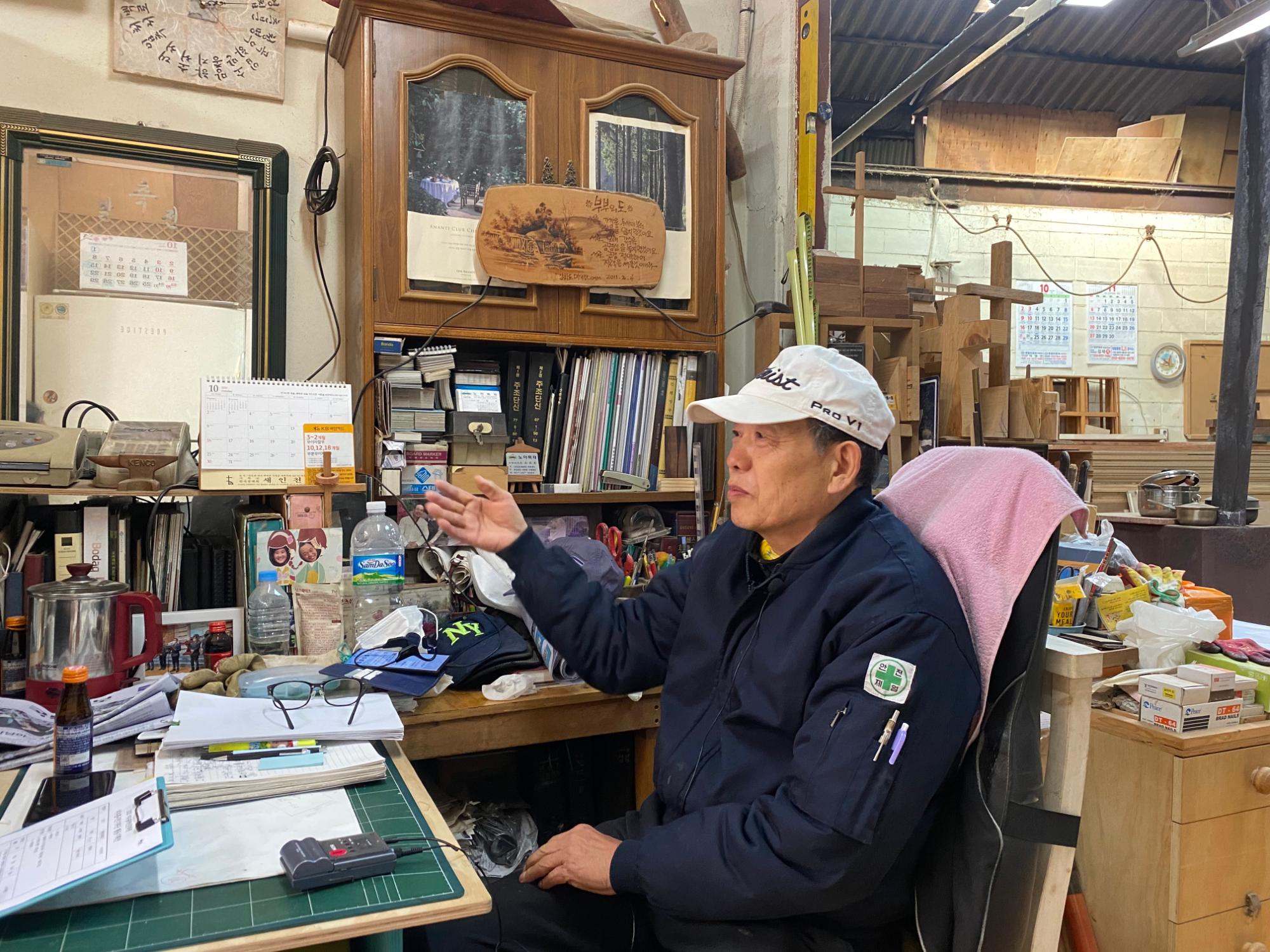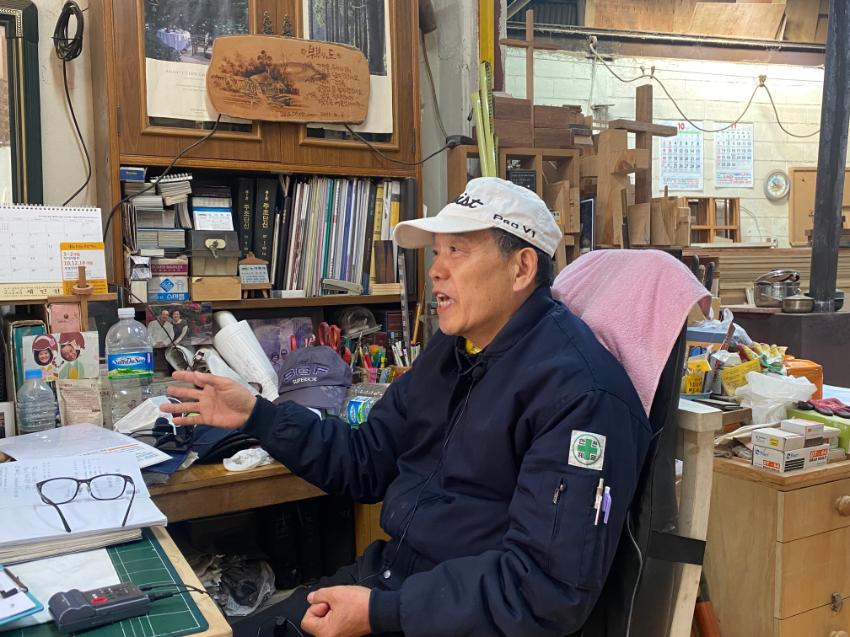 2022년 숭의목공예마을 기록을 위해 미추홀시민기록단 조연희님이 노아목재 김창선 사장님을 인터뷰하는 모습이다. 목공 직업을 주제로 사장님의 삶을 함께 기록하였다.