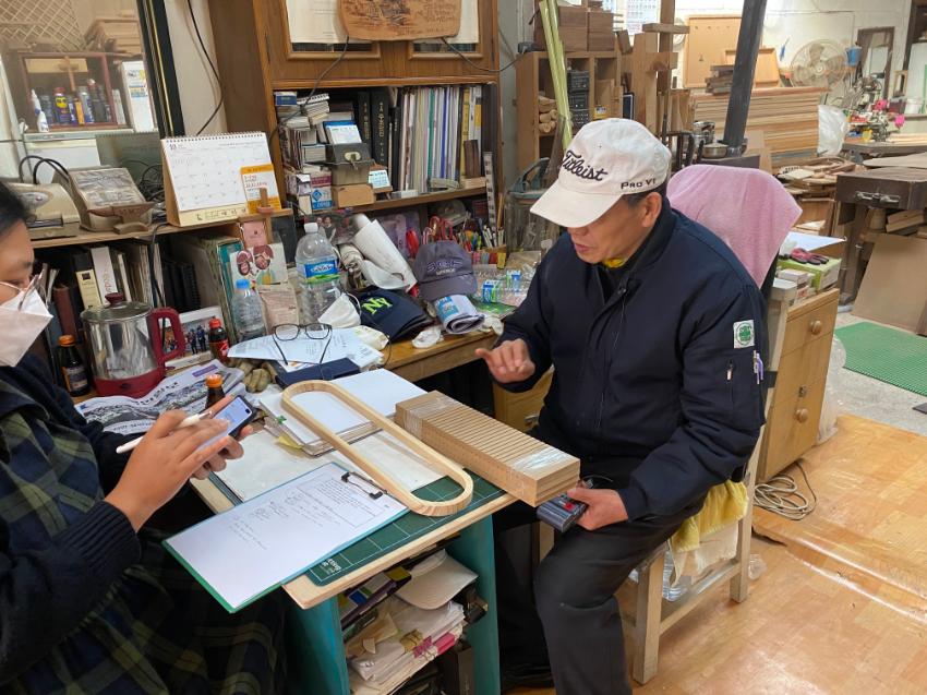 2022년 숭의목공예마을 기록을 위해 미추홀시민기록단 조연희가 노아목재 김창선 사장을 인터뷰하는 모습이다. 목공 직업을 주제로 구술자의 삶을 함께 기록하였다.