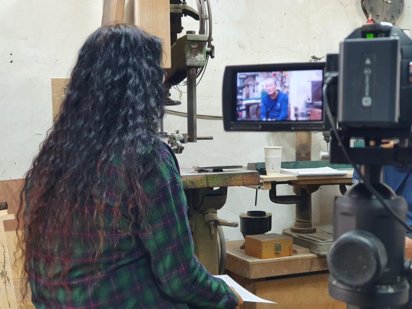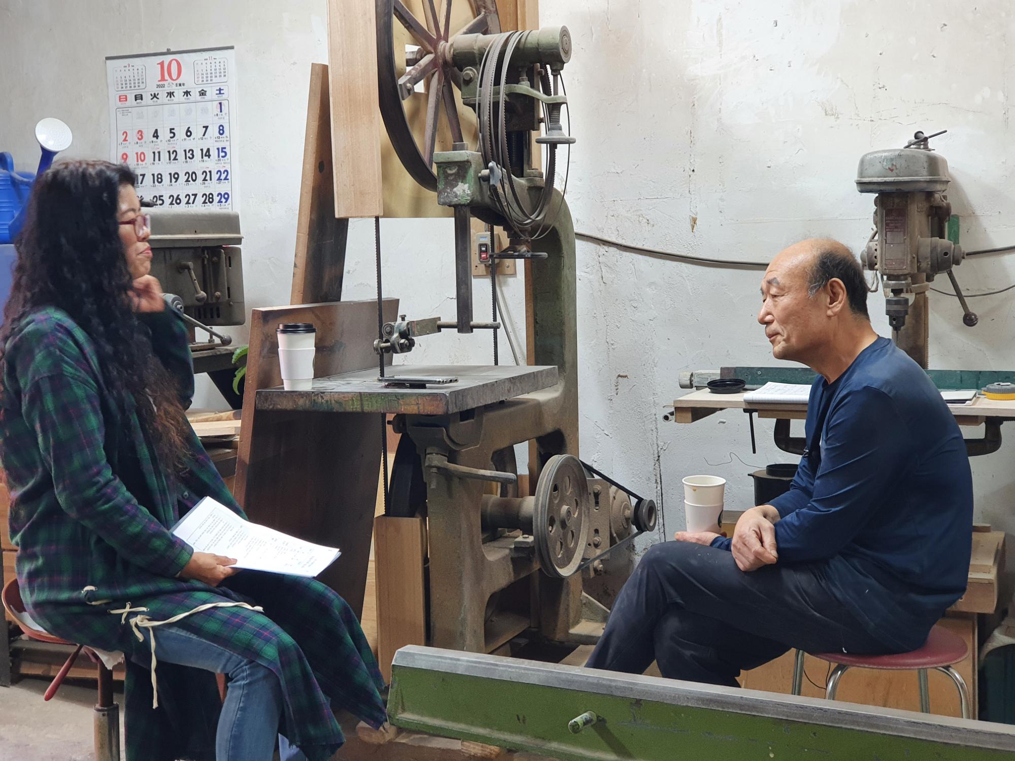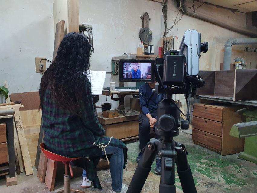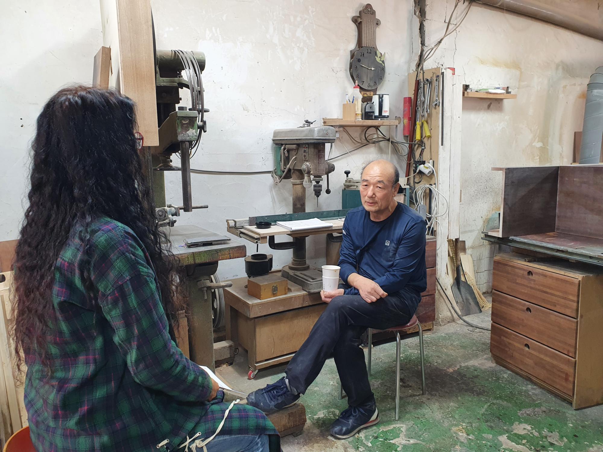 | 변경전 내용 | 2022년 숭의목공예마을 기록을 위해 미추홀시민기록단 이혜숙님이 모던목공방 사장님을 인터뷰하는 모습이다. 목공 직업을 주제로 사장님의 삶을 함께 기록하였다. • 촬영장소 : 모던목공방(미추홀구 숭의동) |